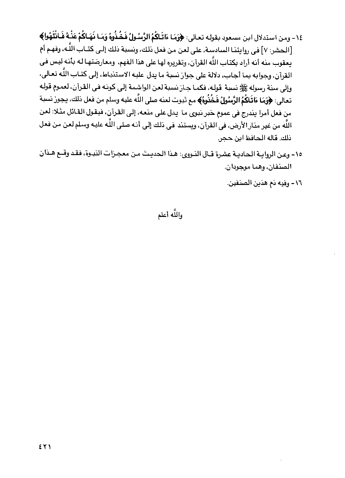 14 - ومن استدلال ابن مسعود بقوله تعالى: {وما ءاتاكم الرسول فخذوه وما نهاكم عنه فانتهوا} [الحشر: 7] في روايتنا السادسة، على لعن من فعل ذلك، ونسبة ذلك إلى كتاب الله، وفهم أم يعقوب منه أنه أراد بكتاب الله القرآن، وتقريره لها على هذا الفهم، ومعارضتها له بأنه ليس في القرآن، وجوابه بما أجاب، دلالة على جواز نسبة ما يدل عليه الاستنباط، إلى كتاب الله تعالى، وإلى سنة رسوله صلى الله عليه وسلم نسبة قوله، فكما جاز نسبة لعن الواشمة إلى كونه في القرآن، لعموم قوله تعالى: {وما ءاتاكم الرسول فخذوه} مع ثبوت لعنه صلى الله عليه وسلم من فعل ذلك، يجوز نسبة من فعل أمراً يندرج في عموم خبر نبوي ما يدل على منعه، إلى القرآن، فيقول القائل مثلاً: لعن الله من غير منار الأرض، في القرآن، ويستند في ذلك إلى أنه صلى الله عليه وسلم لعن من فعل ذلك. قاله الحافظ ابن حجر.