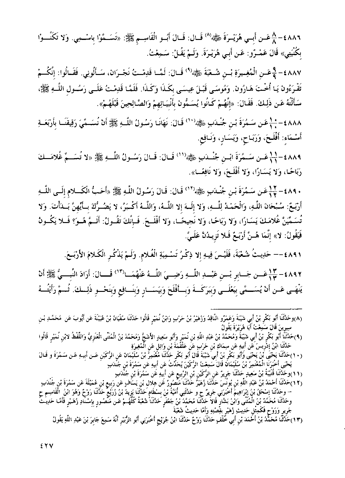 4892 - عن جابر بن عبد الله رضي الله عنهما قال: أراد النبي صلى الله عليه وسلم أن ينهى عن أن يسمى بيعلى وببركة وبأفلح وبيسار وبنافع وبنحو ذلك. ثم رأيته