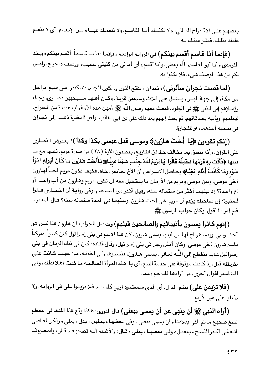 (إنكم تقرءون {يا أخت هارون} وموسى قبل عيسى بكذا وكذا؟ ) يعترض النصارى على القرآن، وأنه ينطق بما يخالف حقائق التاريخ، يقصدون الآية (28) من سورة مريم، نصها مع ما قبلها {فأتت به قومها تحمله قالوا يا مريم لقد جئت شيئاً فرياً* يا أخت هارون ما كان أبوك امرأ سوء وما كانت أمك بغياً} وحاصل الاعتراض أن الأخ يعاصر أخاه، فكيف تكون مريم أختاً لهارون أخي موسى، وبين موسى ومريم من الأزمان ما يستحيل معه أن تكون مريم وهارون من أب واحد، أو أم واحدة؟ إذ بينهما أكثر من ستمائة سنة، وقيل أكثر من ألف عام، وفي رواية أن النصارى قالوا للمغيرة: إن صاحبك يزعم أن مريم هي أخت هارون، وبينهما في المدة ستمائة سنة؟ قال المغيرة: فلم أدر ما أقول، وكان جواب الرسول صلى الله عليه وسلم.