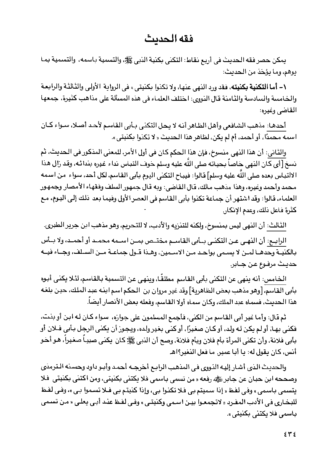 والحديث الذي أشار إليه النووي في المذهب الرابع أخرجه أحمد وأبو داود وحسنه الترمذي وصححه ابن حبان عن جابر رضي الله عنه رفعه "من تسمى باسمي فلا يكتني بكنيتي، ومن اكتنى بكنيتي فلا يتسمى باسمي" وفي لفظ "إذا سميتم بي فلا تكنوا بي، وإذا كنيتم بي فلا تسموا بي"، وفي لفظ للبخاري في الأدب المفرد "لا تجمعوا بين اسمي وكنيتي" وفي لفظ عند أبي يعلى "من تسمى باسمي فلا يكتني بكنيتي".