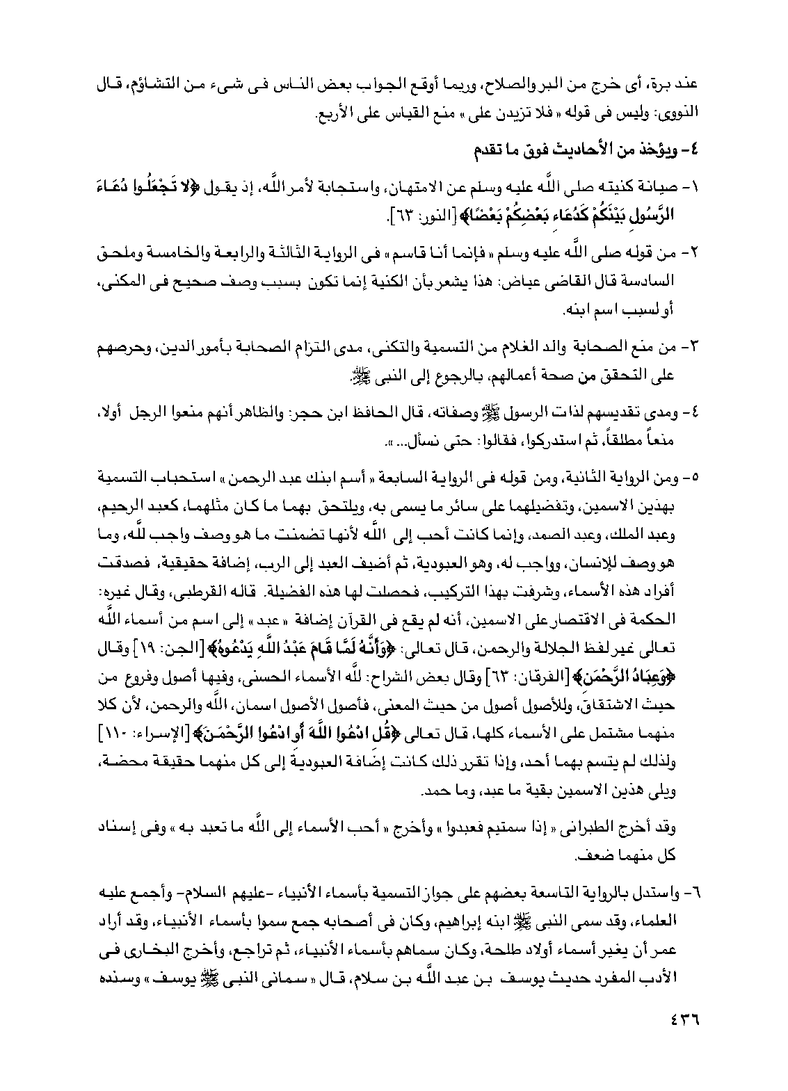5 - ومن الرواية الثانية، ومن قوله في الرواية السابعة "أسم ابنك عبد الرحمن" استحباب التسمية بهذين الاسمين، وتفضيلهما على سائر ما يسمى به، ويلتحق بهما ما كان مثلهما، كعبد الرحيم، وعبد الملك، وعبد الصمد، وإنما كانت أحب إلى الله لأنها تضمنت ما هو وصف واجب لله، وما هو وصف للإنسان، وواجب له، وهو العبودية، ثم أضيف العبد إلى الرب، إضافة حقيقية، فصدقت أفراد هذه الأسماء، وشرفت بهذا التركيب، فحصلت لها هذه الفضيلة. قاله القرطبي: وقال غيره: الحكمة في الاقتصار على الاسمين، أنه لم يقع في القرآن إضافة "عبد" إلى اسم من أسماء الله تعالى غير لفظ الجلالة والرحمن، قال تعالى: {وأنه لما قام عبد الله يدعوه} [الجن: 19] وقال {وعباد الرحمن} [الفرقان: 63] وقال بعض الشراح: لله الأسماء الحسنى، وفيها أصول وفروع من حيث الاشتقاق، وللأصول أصول من حيث المعنى، فأصول الأصول اسمان، الله والرحمن، لأن كلا منهما مشتمل على الأسماء كلها، قال تعالى {قل ادعوا الله أو ادعوا الرحمن} [الإسراء: 110] ولذلك لم يتسم بهما أحد، وإذا تقرر ذلك كانت إضافة العبودية إلى كل منهما حقيقة محضة، ويلي هذين الاسمين بقية ما عبد، وما حمد.