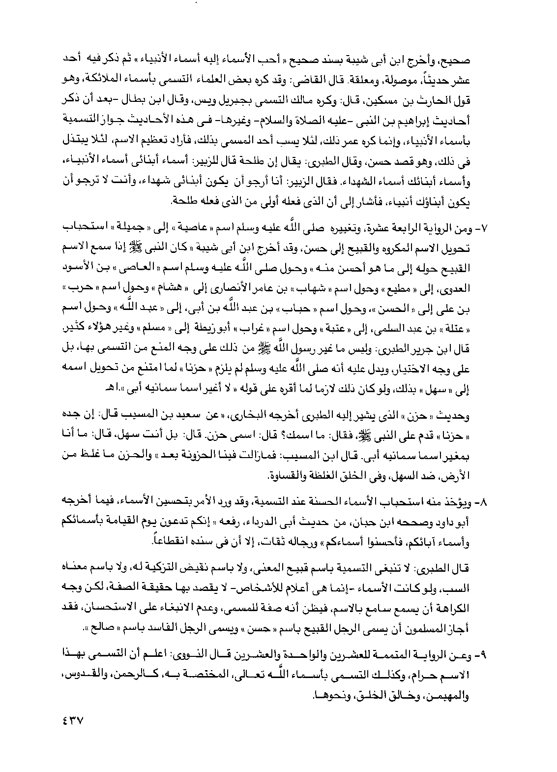 قال الطبري: لا تنبغي التسمية باسم قبيح المعنى، ولا باسم نقيض التزكية له، ولا باسم معناه السب، ولو كانت الأسماء -إنما هي أعلام للأشخاص- لا يقصد بها حقيقة الصفة، لكن وجه الكراهة أن يسمع سامع بالاسم، فيظن أنه صفة للمسمى، وعدم الانبغاء على الاستحسان، فقد أجاز المسلمون أن يسمى الرجل القبيح باسم "حسن" ويسمى الرجل الفاسد باسم "صالح".