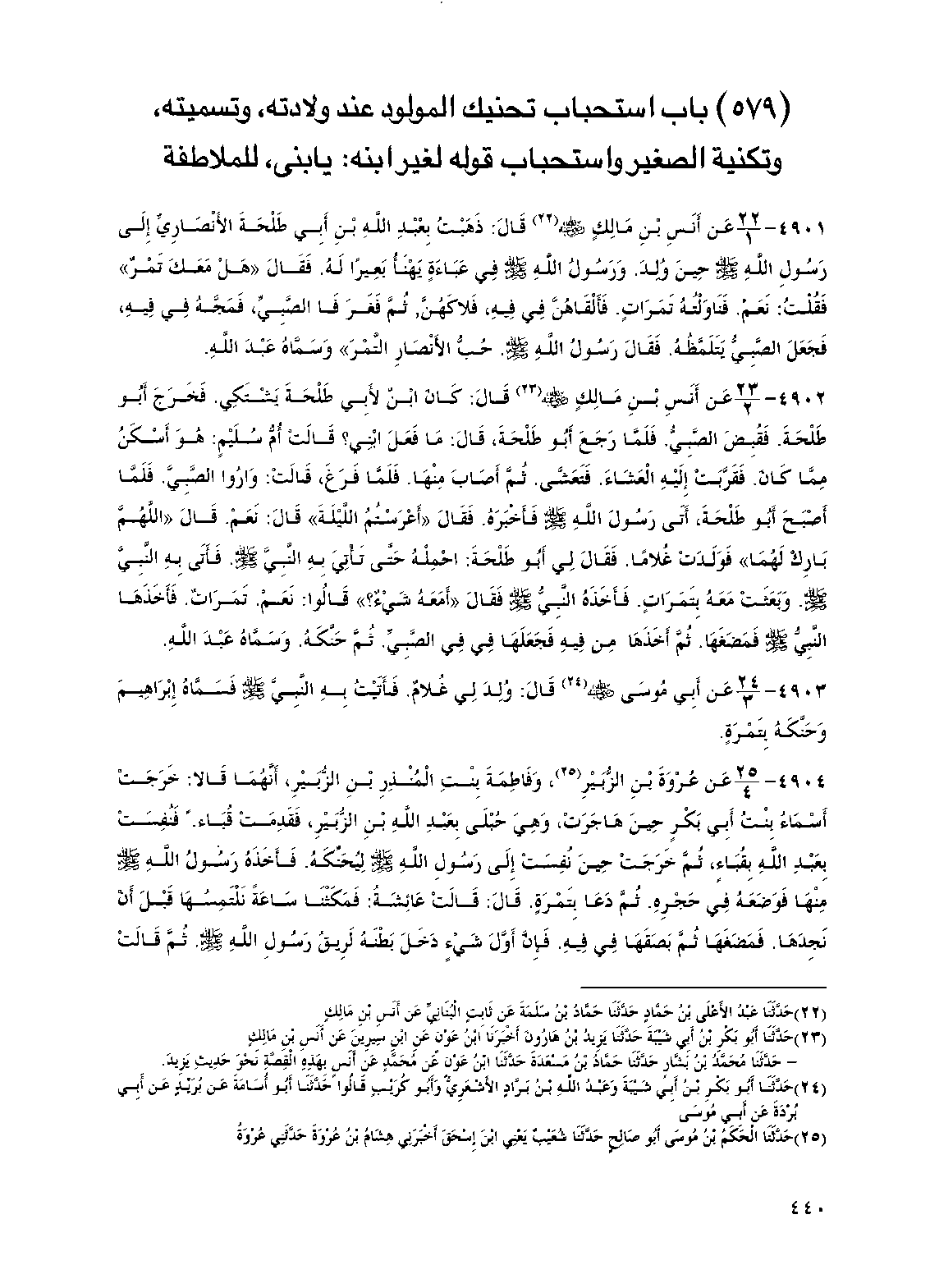 (579) باب استحباب تحنيك المولود عند ولادته، وتسميته، وتكنية الصغير واستحباب قوله لغير ابنه: يا بني، للملاطفة