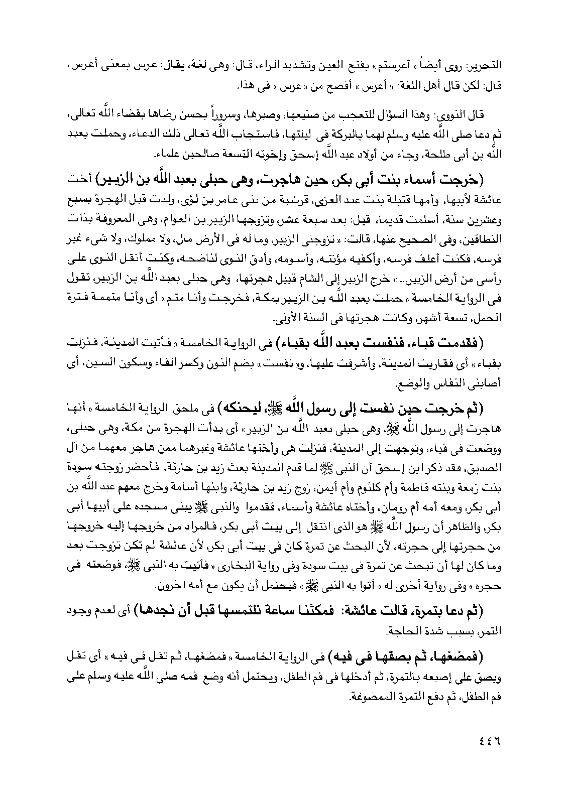 (ثم خرجت حين نفست إلى رسول الله صلى الله عليه وسلم، ليحنكه) في ملحق الرواية الخامسة "أنها هاجرت إلى رسول الله صلى الله عليه وسلم، وهي حبلى بعبد الله بن الزبير" أي بدأت الهجرة من مكة، وهي حبلى، ووضعت في قباء، وتوجهت إلى المدينة، فنزلت هي وأختها عائشة وغيرهما ممن هاجر معهما من آل الصديق، فقد ذكر ابن إسحق أن النبي صلى الله عليه وسلم لما قدم المدينة بعث زيد بن حارثة، فأحضر زوجته سودة بنت زمعة وبنته فاطمة وأم كلثوم وأم أيمن، زوج زيد بن حارثة، وابنها أسامة وخرج معهم عبد الله بن أبي بكر، ومعه أمه أم رومان، وأختاه عائشة وأسماء، فقدموا والنبي صلى الله عليه وسلم يبني مسجده على أبيها أبي بكر، والظاهر أن رسول الله صلى الله عليه وسلم هو الذي انتقل إلى بيت أبي بكر، فالمراد من خروجها إليه خروجها من حجرتها إلى حجرته، لأن البحث عن تمرة كان في بيت أبي بكر، لأن عائشة لم تكن تزوجت بعد وما كان لها أن تبحث عن تمرة في بيت سودة وفي رواية البخاري "فأتيت به النبي صلى الله عليه وسلم، فوضعته في حجره" وفي رواية أخرى له "أتوا به النبي صلى الله عليه وسلم" فيحتمل أن يكون مع أمه آخرون.