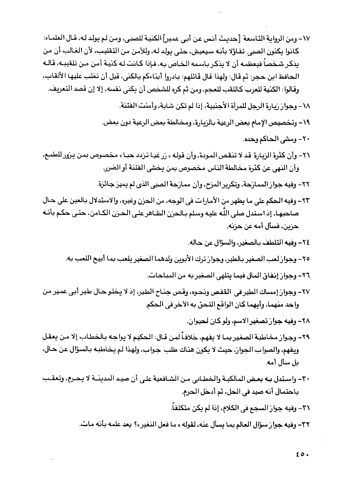 17 - ومن الرواية التاسعة [حديث أنس عن أبي عمير] الكنية للصبي، ومن لم يولد له، قال العلماء: كانوا يكنون الصبي تفاؤلاً بأنه سيعيش، حتى يولد له، وللأمن من التقليب، لأن الغالب أن من يذكر شخصاً فيعظمه أن لا يذكر باسمه الخاص به، فإذا كانت له كنية أمن من تلقيبه، قاله الحافظ ابن حجر: ثم قال: ولهذا قال قائلهم: بادروا أبناءكم بالكنى، قبل أن تغلب عليها الألقاب، وقالوا: الكنية للعرب كاللقب للعجم، ومن ثم كره للشخص أن يكني نفسه، إلا إن قصد التعريف.