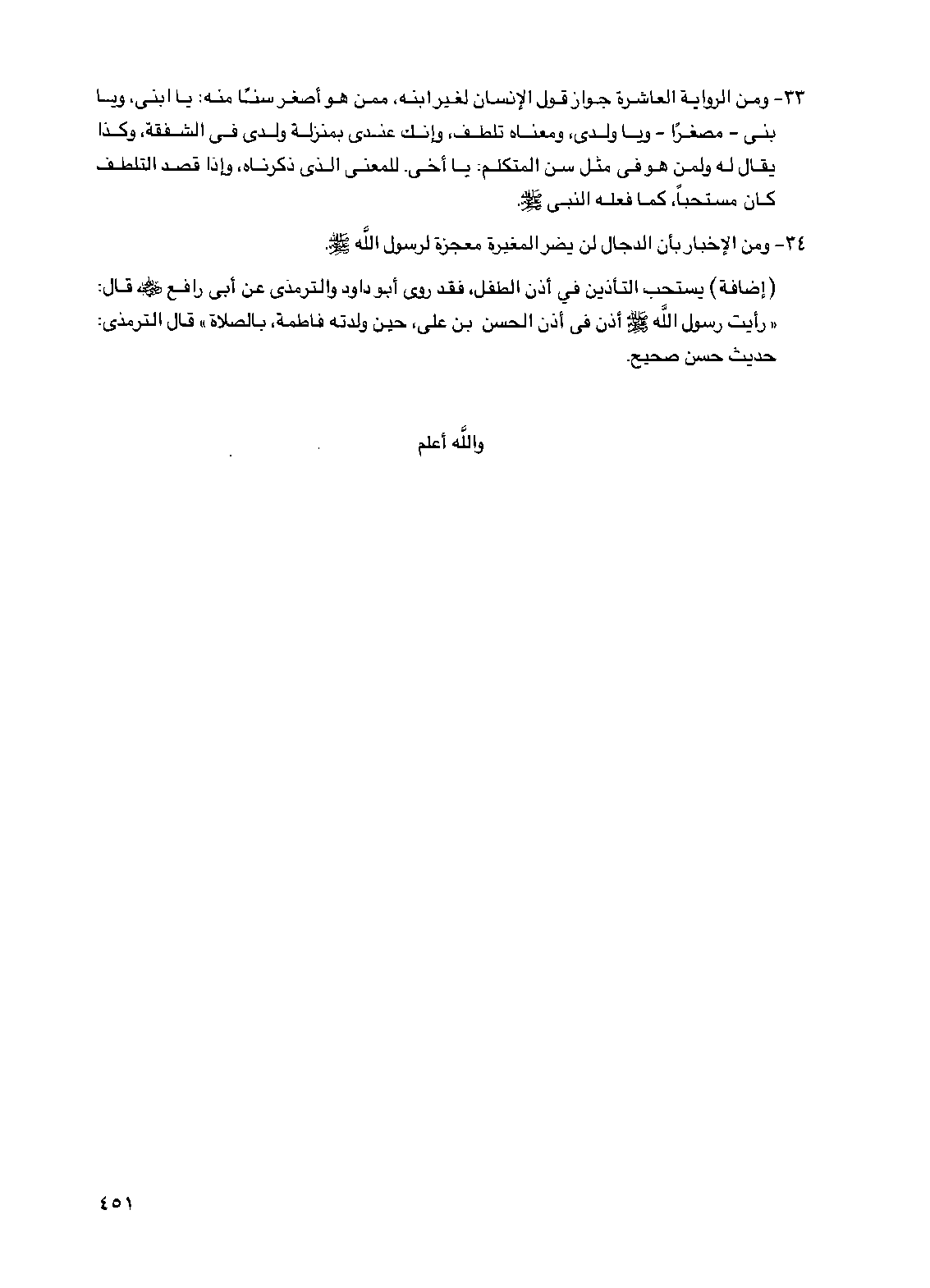 (إضافة) يستحب التأذين في أذن الطفل، فقد روى أبو داود والترمذي عن أبي رافع رضي الله عنه قال: "رأيت رسول الله صلى الله عليه وسلم أذن في أذن الحسن بن علي، حين ولدته فاطمة، بالصلاة" قال الترمذي: حديث حسن صحيح.