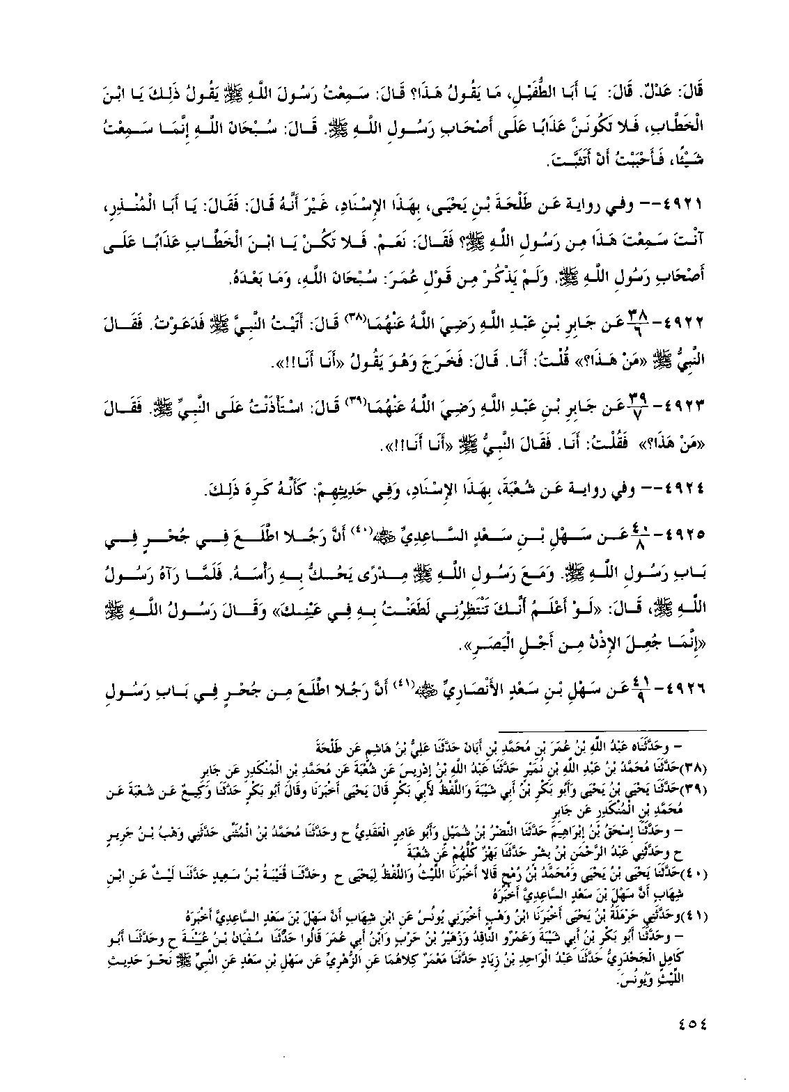 4922 - عن جابر بن عبد الله رضي الله عنهما قال: أتيت النبي صلى الله عليه وسلم فدعوت. فقال النبي صلى الله عليه وسلم "من هذا؟ " قلت: أنا. قال: فخرج وهو يقول "أنا أنا! ! ".