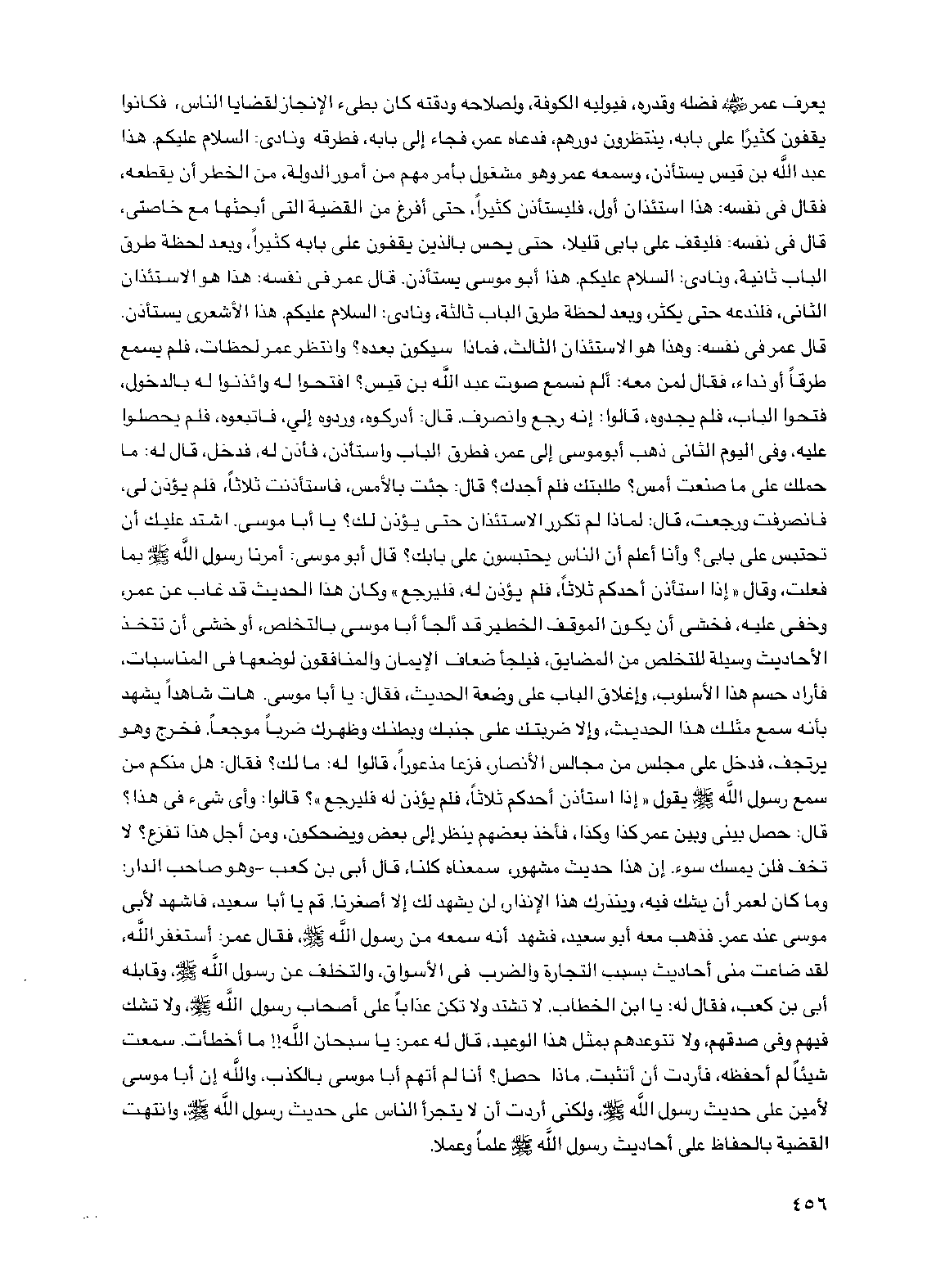 اشتد عليك أن تحتبس على بابي؟ وأنا أعلم أن الناس يحتبسون على بابك؟ قال أبو موسى: أمرنا رسول الله صلى الله عليه وسلم بما فعلت، وقال "إذا استأذن أحدكم ثلاثاً، فلم يؤذن له، فليرجع" وكان هذا الحديث قد غاب عن عمر، وخفي عليه، فخشي أن يكون الموقف الخطير قد ألجأ أبا موسى بالتخلص، أو خشي أن تتخذ الأحاديث وسيلة للتخلص من المضايق، فيلجأ ضعاف الإيمان والمنافقون لوضعها في المناسبات، فأراد حسم هذا الأسلوب، وإغلاق الباب على وضعة الحديث، فقال: يا أبا موسى. هات شاهداً يشهد بأنه سمع مثلك هذا الحديث، وإلا ضربتك على جنبك وبطنك وظهرك ضرباً موجعاً. فخرج وهو يرتجف، فدخل على مجلس من مجالس الأنصار، فزعاً مذعوراً، قالوا له: ما لك؟ فقال: هل منكم من سمع رسول الله صلى الله عليه وسلم يقول "إذا استأذن أحدكم ثلاثاً، فلم يؤذن له فليرجع"؟ قالوا: وأي شيء في هذا؟ قال: حصل بيني وبين عمر كذا وكذا، فأخذ بعضهم ينظر إلى بعض ويضحكون، ومن أجل هذا تفزع؟ لا تخف فلن يمسك سوء. إن هذا حديث مشهور، سمعناه كلنا، قال أبي بن كعب -وهو صاحب الدار: وما كان لعمر أن يشك فيه، وينذرك هذا الإنذار، لن يشهد لك إلا أصغرنا. قم يا أبا سعيد، فاشهد لأبي موسى عند عمر. فذهب معه أبو سعيد، فشهد أنه سمعه من رسول الله صلى الله عليه وسلم، فقال عمر: أستغفر الله، لقد ضاعت مني أحاديث بسبب التجارة والضرب في الأسواق، والتخلف عن رسول الله صلى الله عليه وسلم، وقابله أبي بن كعب، فقال له: يا ابن الخطاب. لا تشتد ولا تكن عذاباً على أصحاب رسول الله صلى الله عليه وسلم، ولا تشك فيهم وفي صدقهم، ولا تتوعدهم بمثل هذا الوعيد، قال له عمر: يا سبحان الله! ! ما أخطأت. سمعت شيئاً لم أحفظه، فأردت أن أتثبت.