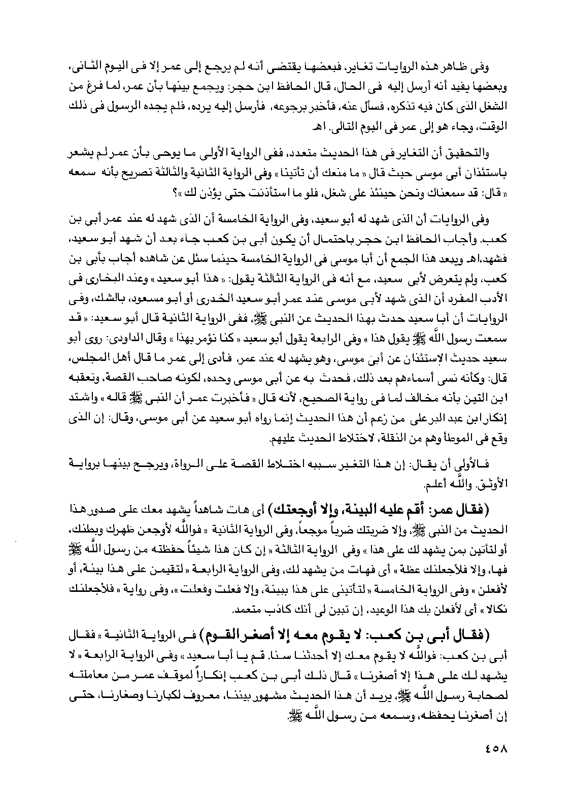 (فقال عمر: أقم عليه البينة، وإلا أوجعتك) أي هات شاهداً يشهد معك على صدور هذا الحديث من النبي صلى الله عليه وسلم، وإلا ضربتك ضرباً موجعاً، وفي الرواية الثانية "فوالله لأوجعن ظهرك وبطنك، أو لتأتين بمن يشهد لك على هذا" وفي الرواية الثالثة "إن كان هذا شيئاً حفظته من رسول الله صلى الله عليه وسلم فها، وإلا فلأجعلنك عظة" أي فهات من يشهد لك، وفي الرواية الرابعة "لتقيمن على هذا بينة، أو لأفعلن" وفي الرواية الخامسة "لتأتيني على هذا ببينة، وإلا فعلت وفعلت"، وفي رواية "فلأجعلنك نكالاً" أي لأفعلن بك هذا الوعيد، إن تبين لي أنك كاذب متعمد.