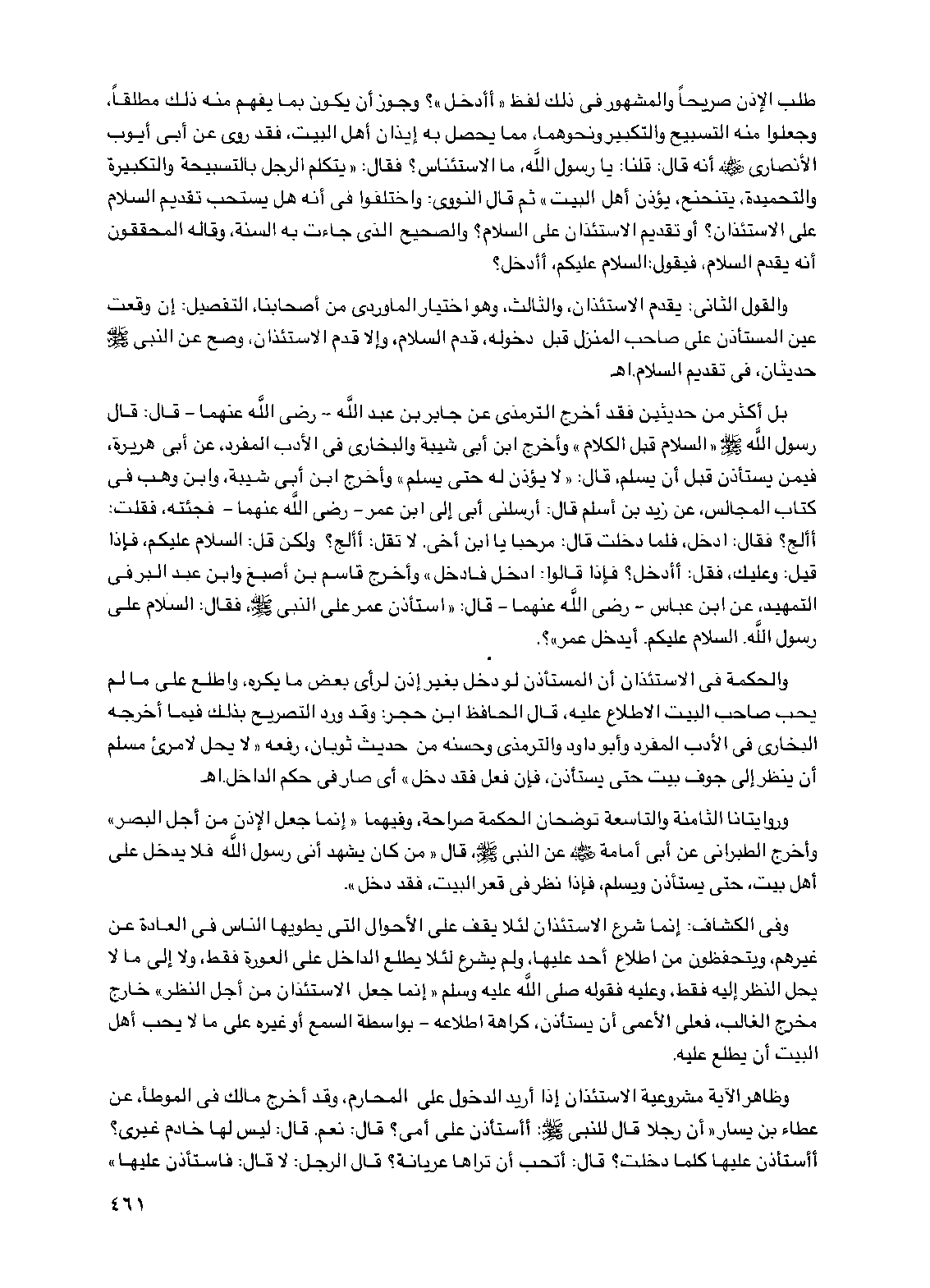 وروايتانا الثامنة والتاسعة توضحان الحكمة صراحة، وفيهما "إنما جعل الإذن من أجل البصر" وأخرج الطبراني عن أبي أمامة رضي الله عنه عن النبي صلى الله عليه وسلم، قال "من كان يشهد أني رسول الله فلا يدخل على أهل بيت، حتى يستأذن ويسلم، فإذا نظر في قعر البيت، فقد دخل".