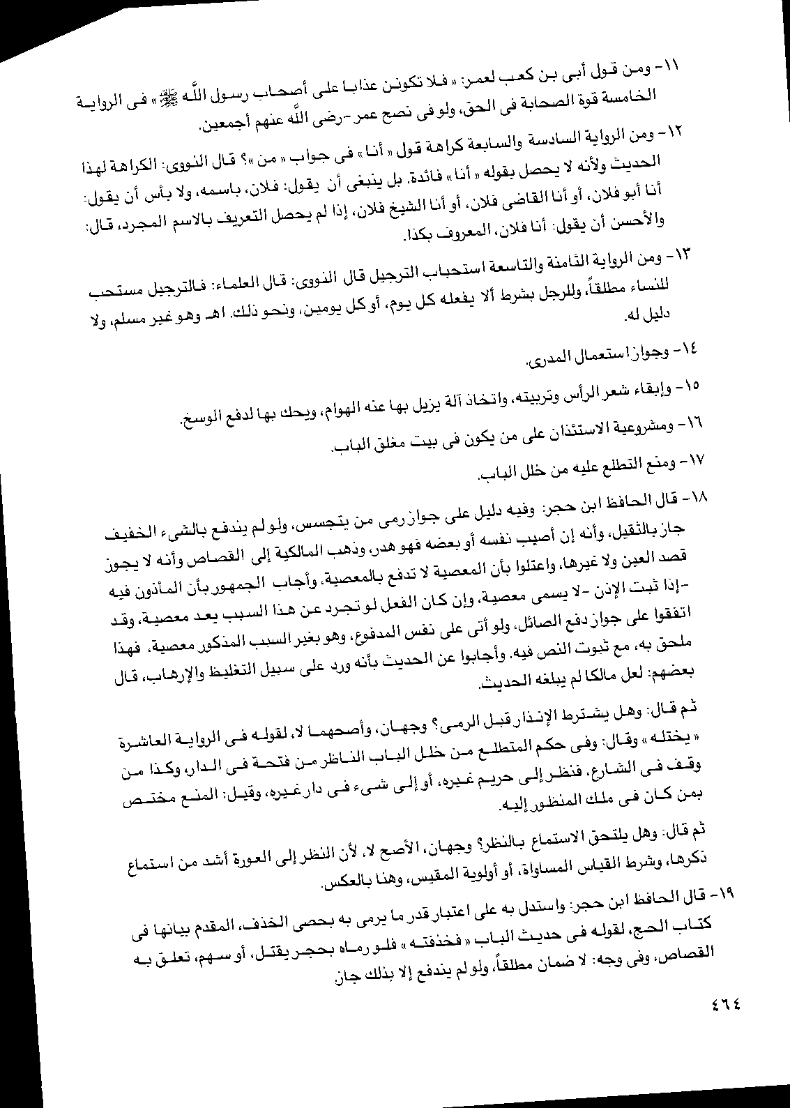 13 - ومن الرواية الثامنة والتاسعة استحباب الترجيل قال النووي: قال العلماء: فالترجيل مستحب للنساء مطلقاً، وللرجل بشرط ألا يفعله كل يوم، أو كل يومين، ونحو ذلك. اهـ وهو غير مسلم، ولا دليل له.