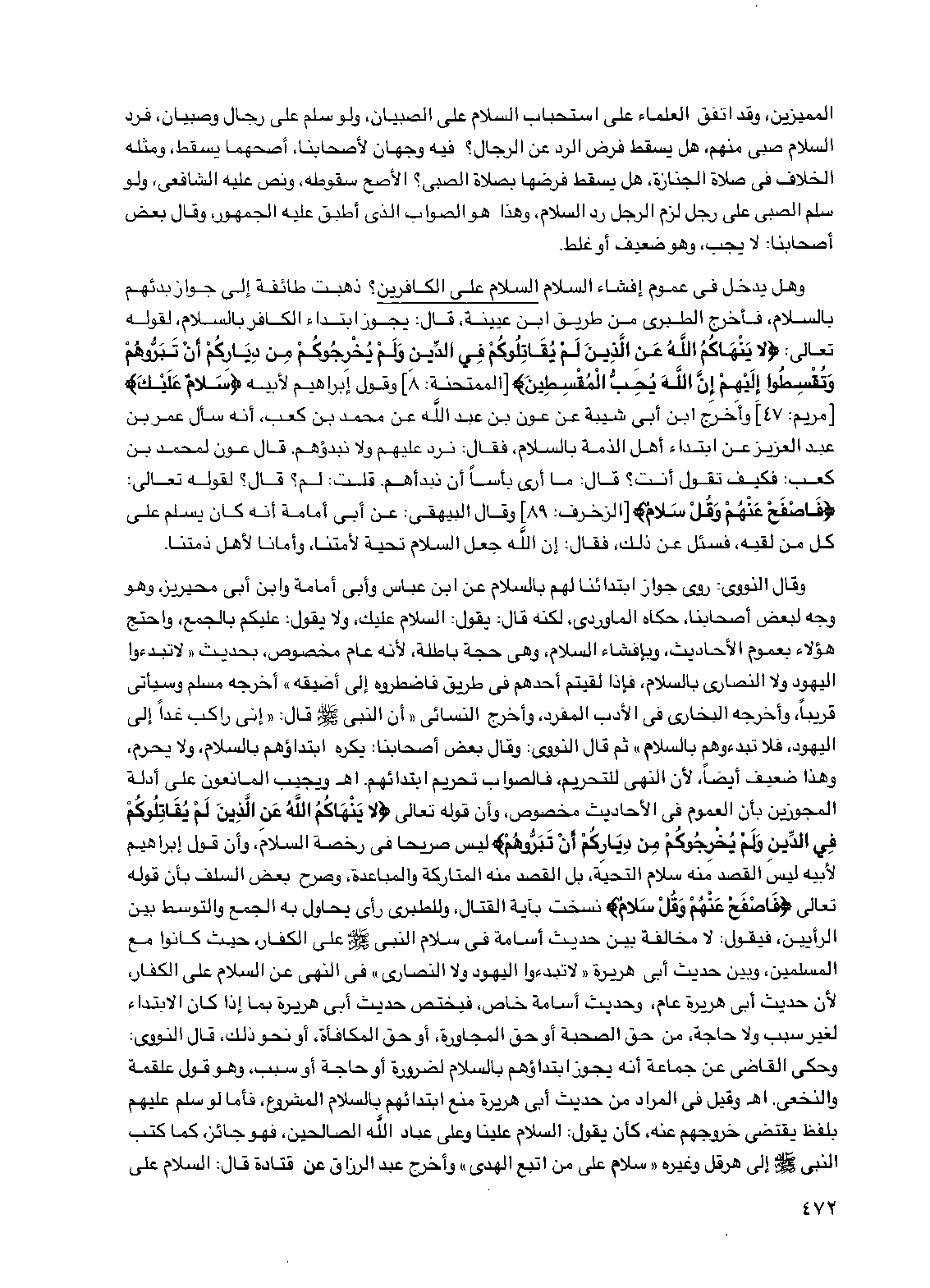 وهل يدخل في عموم إفشاء السلام السلام على الكافرين؟ ذهبت طائفة إلى جواز بدئهم بالسلام، فأخرج الطبري من طريق ابن عيينة، قال: يجوز ابتداء الكافر بالسلام، لقوله تعالى: {لا ينهاكم الله عن الذين لم يقاتلوكم في الدين ولم يخرجوكم من دياركم أن تبروهم وتقسطوا إليهم إن الله يحب المقسطين} [الممتحنة: 8] وقول إبراهيم لأبيه {سلام عليك} [مريم: 47] وأخرج ابن أبي شيبة عن عون بن عبد الله عن محمد بن كعب، أنه سأل عمر بن عبد العزيز عن ابتداء أهل الذمة بالسلام، فقال: نرد عليهم ولا نبدؤهم. قال عون لمحمد بن كعب: فكيف تقول أنت؟ قال: ما أرى بأساً أن نبدأهم. قلت: لم؟ قال؟ لقوله تعالى: {فاصفح عنهم وقل سلام} [الزخرف: 89] وقال البيهقي: عن أبي أمامة أنه كان يسلم على كل من لقيه، فسئل عن ذلك، فقال: إن الله جعل السلام تحية لأمتنا، وأماناً لأهل ذمتنا.