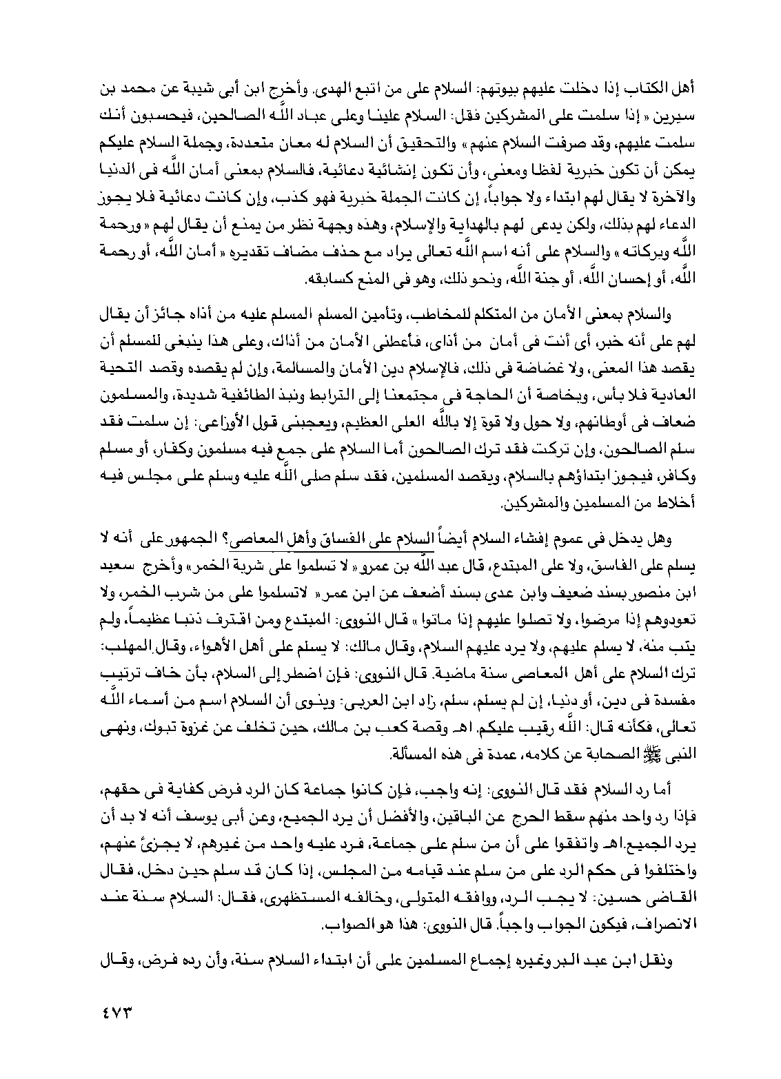 أهل الكتاب إذا دخلت عليهم بيوتهم: السلام على من اتبع الهدى. وأخرج ابن أبي شيبة عن محمد بن سيرين "إذا سلمت على المشركين فقل: السلام علينا وعلى عباد الله الصالحين، فيحسبون أنك سلمت عليهم، وقد صرفت السلام عنهم" والتحقيق أن السلام له معان متعددة، وجملة السلام عليكم يمكن أن تكون خبرية لفظاً ومعنى، وأن تكون إنشائية دعائية، فالسلام بمعنى أمان الله في الدنيا والآخرة لا يقال لهم ابتداء ولا جواباً، إن كانت الجملة خبرية فهو كذب، وإن كانت دعائية فلا يجوز الدعاء لهم بذلك، ولكن يدعى لهم بالهداية والإسلام، وهذه وجهة نظر من يمنع أن يقال لهم "ورحمة الله وبركاته" والسلام على أنه اسم الله تعالى يراد مع حذف مضاف تقديره "أمان الله، أو رحمة الله، أو إحسان الله، أو جنة الله، ونحو ذلك، وهو في المنع كسابقه.