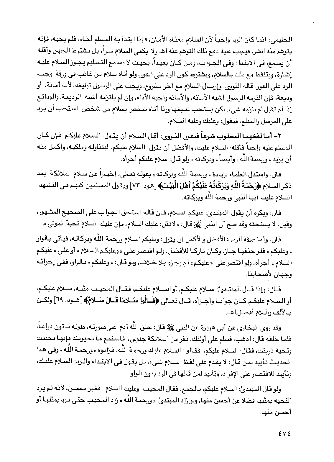 وقد روى البخاري عن أبي هريرة عن النبي صلى الله عليه وسلم قال: خلق الله آدم على صورته، طوله ستون ذراعاً، فلما خلقه قال: اذهب، فسلم على أولئك، نفر من الملائكة جلوس، فاستمع ما يحيونك فإنها تحيتك وتحية ذريتك، فقال: السلام عليكم، فقالوا: السلام عليك ورحمة الله، فزادوه "ورحمة الله" وفي هذا الحديث تأييد لمن قال: لا يقدم على لفظ السلام شيء، بل يقول في الابتداء والرد: السلام عليك، وتأييد للاقتصار على الإفراد، وتأييد لمن قالها في الرد بدون الواو.