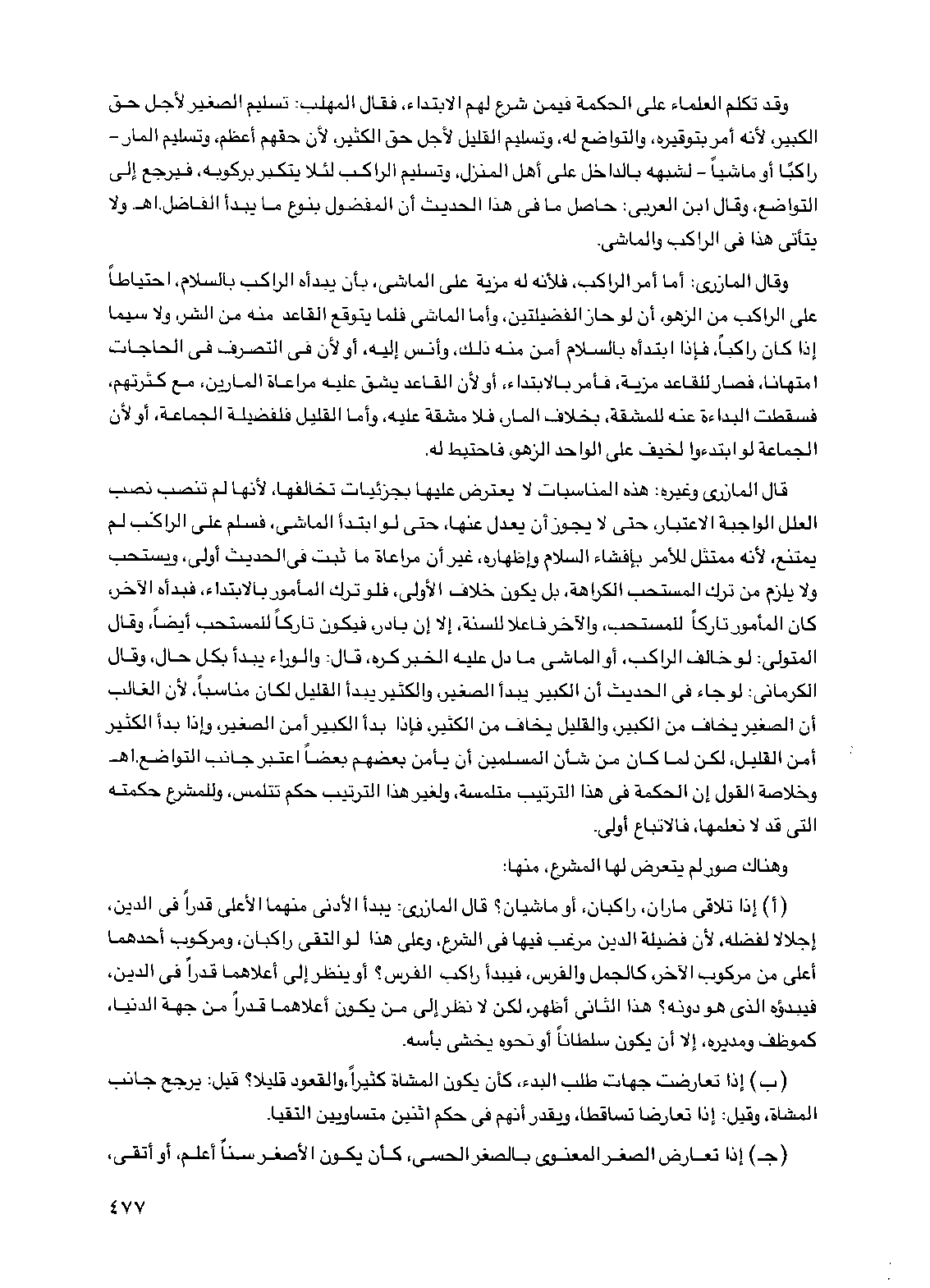 (أ) إذا تلاقى ماران، راكبان، أو ماشيان؟ قال المازري: يبدأ الأدنى منهما الأعلى قدراً في الدين، إجلالاً لفضله، لأن فضيلة الدين مرغب فيها في الشرع، وعلى هذا لو التقى راكبان، ومركوب أحدهما أعلى من مركوب الآخر، كالجمل والفرس، فيبدأ راكب الفرس؟ أو ينظر إلى أعلاهما قدراً في الدين، فيبدؤه الذي هو دونه؟ هذا الثاني أظهر، لكن لا نظر إلى من يكون أعلاهما قدراً من جهة الدنيا، كموظف ومديره، إلا أن يكون سلطاناً أو نحوه يخشى بأسه.