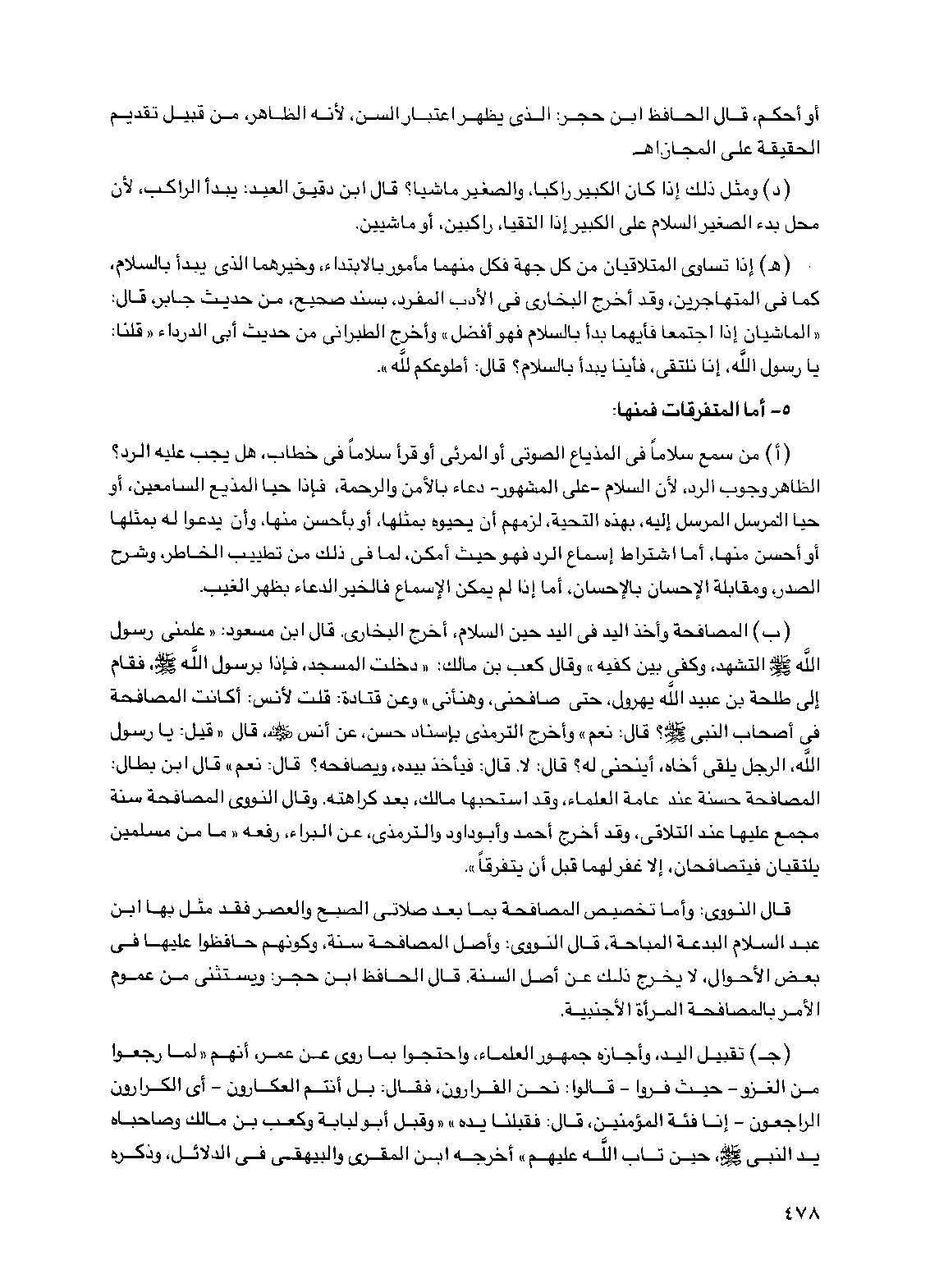 (ب) المصافحة وأخذ اليد في اليد حين السلام، أخرج البخاري. قال ابن مسعود: "علمني رسول الله صلى الله عليه وسلم التشهد، وكفي بين كفيه" وقال كعب بن مالك: "دخلت المسجد، فإذا برسول الله صلى الله عليه وسلم، فقام إلى طلحة بن عبيد الله يهرول، حتى صافحني، وهنأني" وعن قتادة: قلت لأنس: أكانت المصافحة في أصحاب النبي صلى الله عليه وسلم؟ قال: نعم" وأخرج الترمذي بإسناد حسن، عن أنس رضي الله عنه، قال: "قيل: يا رسول الله، الرجل يلقى أخاه، أينحني له؟ قال: لا. قال: فيأخذ بيده، ويصافحه؟ قال: نعم" قال ابن بطال: المصافحة حسنة عند عامة العلماء، وقد استحبها مالك، بعد كراهته. وقال النووي المصافحة سنة مجمع عليها عند التلاقي، وقد أخرج أحمد وأبو داود والترمذي، عن البراء، رفعه "ما من مسلمين يلتقيان فيتصافحان، إلا غفر لهما قبل أن يتفرقا".