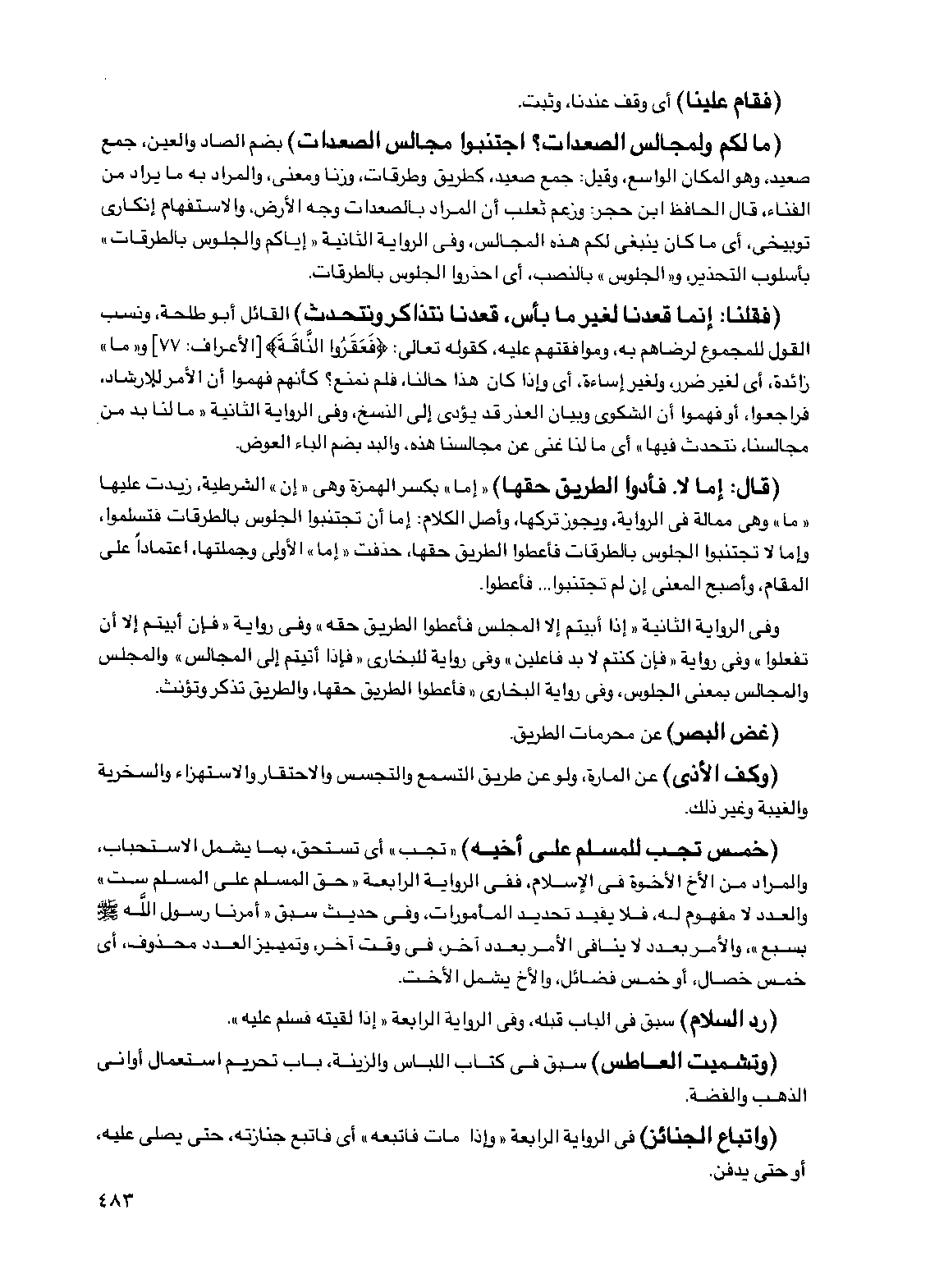 (ما لكم ولمجالس الصعدات؟ اجتنبوا مجالس الصعدات) بضم الصاد والعين، جمع صعيد، وهو المكان الواسع، وقيل: جمع صعيد، كطريق وطرقات، وزناً ومعنى، والمراد به ما يراد من الفناء، قال الحافظ ابن حجر: وزعم ثعلب أن المراد بالصعدات وجه الأرض، والاستفهام إنكاري توبيخي، أي ما كان ينبغي لكم هذه المجالس، وفي الرواية الثانية "إياكم والجلوس بالطرقات" بأسلوب التحذير، و"الجلوس" بالنصب، أي احذروا الجلوس بالطرقات.