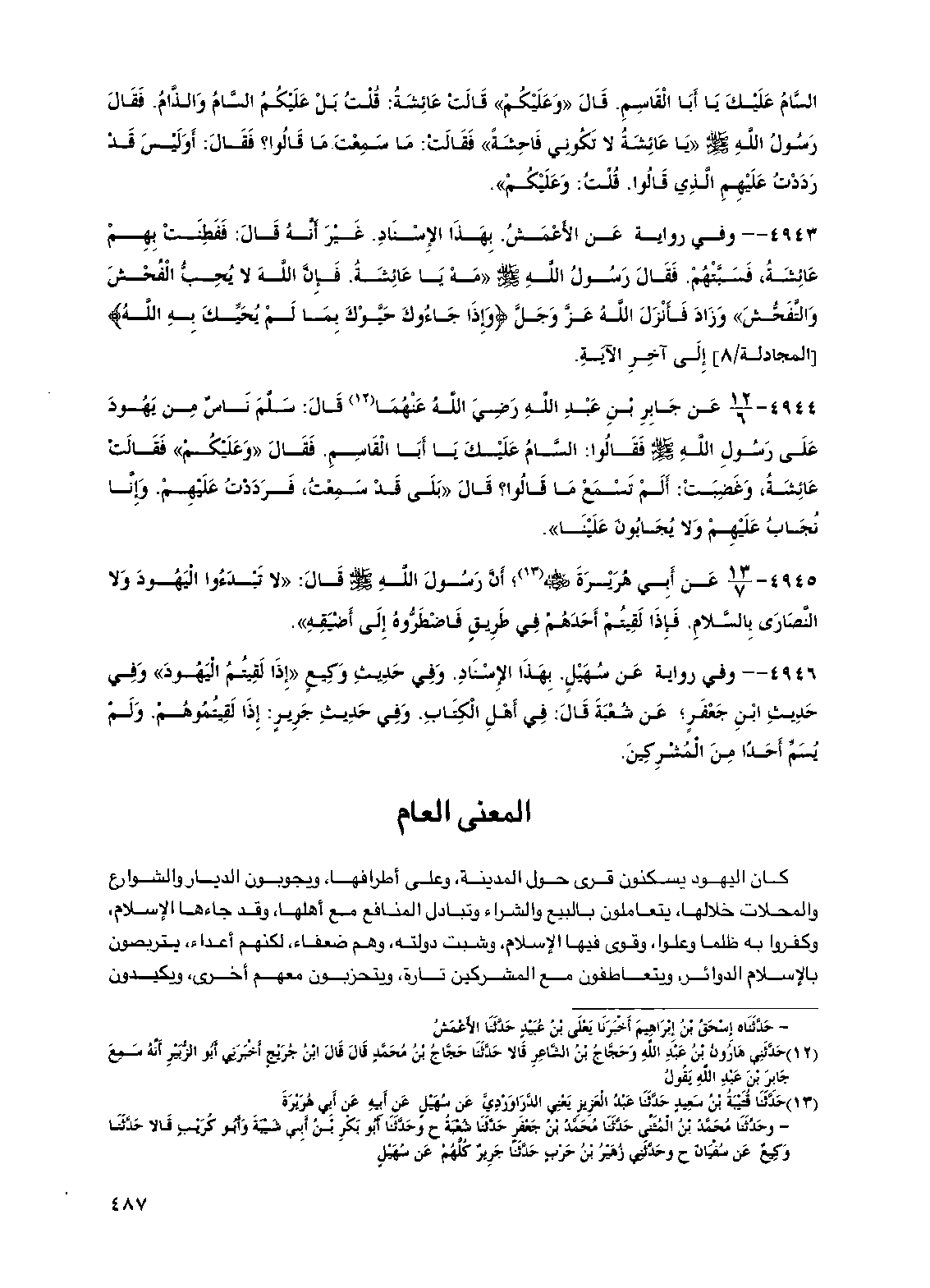 4944 - عن جابر بن عبد الله رضي الله عنهما قال: سلم ناس من يهود على رسول الله صلى الله عليه وسلم فقالوا: السام عليك يا أبا القاسم. فقال "وعليكم" فقالت عائشة، وغضبت: ألم تسمع ما قالوا؟ قال "بلى قد سمعت، فرددت عليهم. وإنا نجاب عليهم ولا يجابون علينا".