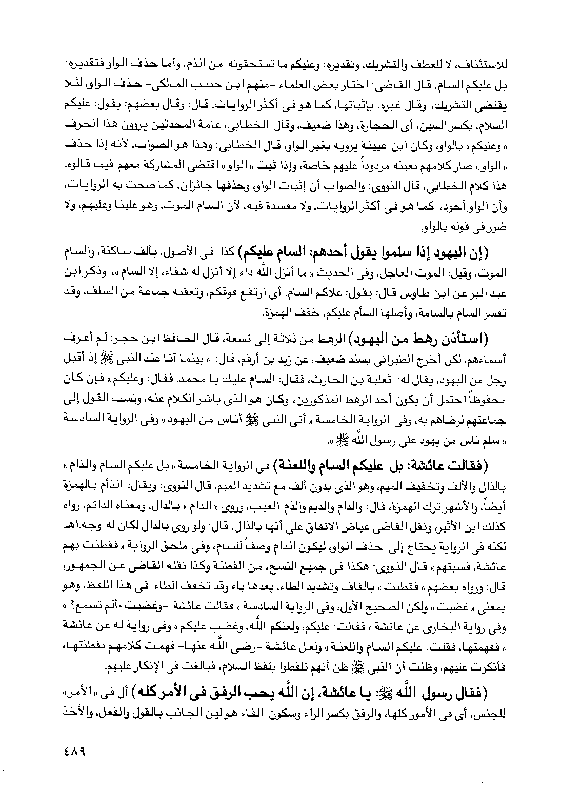 للاستئناف، لا للعطف والتشريك، وتقديره: وعليكم ما تستحقونه من الذم، وأما حذف الواو فتقديره: بل عليكم السام، قال القاضي: اختار بعض العلماء -منهم ابن حبيب المالكي- حذف الواو، لئلا يقتضي التشريك، وقال غيره: بإثباتها، كما هو في أكثر الروايات. قال: وقال بعضهم: يقول: عليكم السلام، بكسر السين، أي الحجارة، وهذا ضعيف، وقال الخطابي، عامة المحدثين يروون هذا الحرف "وعليكم" بالواو، وكان ابن عيينة يرويه بغير الواو، قال الخطابي: وهذا هو الصواب، لأنه إذا حذف "الواو" صار كلامهم بعينه مردوداً عليهم خاصة، وإذا ثبت "الواو" اقتضى المشاركة معهم فيما قالوه. هذا كلام الخطابي، قال النووي: والصواب أن إثبات الواو، وحذفها جائزان، كما صحت به الروايات، وأن الواو أجود، كما هو في أكثر الروايات، ولا مفسدة فيه، لأن السام الموت، وهو علينا وعليهم، ولا ضرر في قوله بالواو.