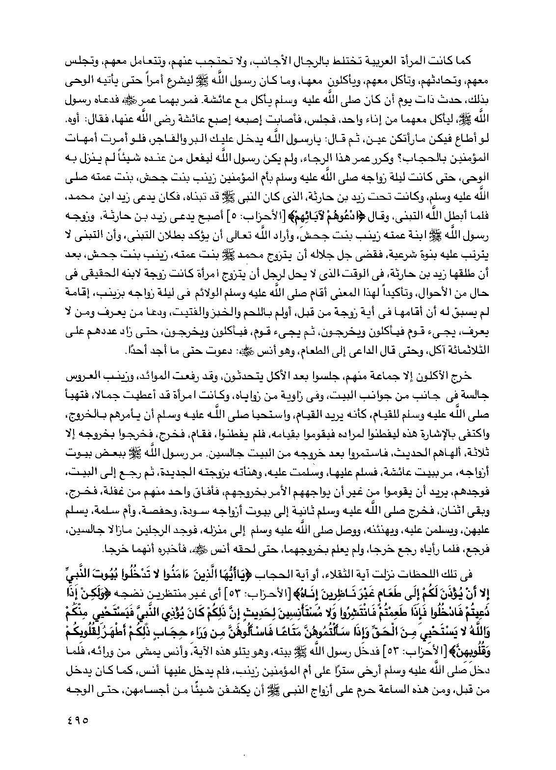 كما كانت المرأة العربية تختلط بالرجال الأجانب، ولا تحتجب عنهم، وتتعامل معهم، وتجلس معهم، وتحادثهم، وتأكل معهم، ويأكلون معها، وما كان رسول الله صلى الله عليه وسلم ليشرع أمراً حتى يأتيه الوحي بذلك، حدث ذات يوم أن كان صلى الله عليه وسلم يأكل مع عائشة. فمر بهما عمر رضي الله عنه فدعاه رسول الله صلى الله عليه وسلم، ليأكل معهما من إناء واحد، فجلس، فأصابت إصبعه إصبع عائشة رضي الله عنها، فقال: أوه. لو أطاع فيكن ما رأتكن عين، ثم قال: يا رسول الله يدخل عليك البر والفاجر، فلو أمرت أمهات المؤمنين بالحجاب؟ وكرر عمر هذا الرجاء، ولم يكن رسول الله ليفعل من عنده شيئاً لم ينزل به الوحي، حتى كانت ليلة زواجه صلى الله عليه وسلم بأم المؤمنين زينب بنت جحش، بنت عمته صلى الله عليه وسلم، وكانت تحت زيد بن حارثة، الذي كان النبي صلى الله عليه وسلم قد نبناه، فكان يدعى زيد بن محمد، فلما أبطل الله التبني، وقال {ادعوهم لآبائهم} [الأحزاب: 5] أصبح يدعى زيد بن حارثة، وزوجه رسول الله صلى الله عليه وسلم ابنة عمته زينب بنت جحش، وأراد الله تعالى أن يؤكد بطلان التبني، وأن التبني لا يترتب عليه بنوة شرعية، فقضى جل جلاله أن يتزوج محمد صلى الله عليه وسلم بنت عمته، زينب بنت جحش، بعد أن طلقها زيد بن حارثة، في الوقت الذي لا يحل لرجل أن يتزوج امرأة كانت زوجة لابنه الحقيقي في حال من الأحوال، وتأكيداً لهذا المعنى أقام صلى الله عليه وسلم الولائم في ليلة زواجه بزينب، إقامة لم يسبق له أن أقامها في أية زوجة من قبل، أولم باللحم والخبز والفتيت، ودعا من يعرف ومن لا يعرف، يجيء قوم فيأكلون ويخرجون، ثم يجيء قوم، فيأكلون ويخرجون، حتى زاد عددهم على الثلاثمائة آكل، وحتى قال الداعي إلى الطعام، وهو أنس رضي الله عنه: دعوت حتى ما أجد أحداً.