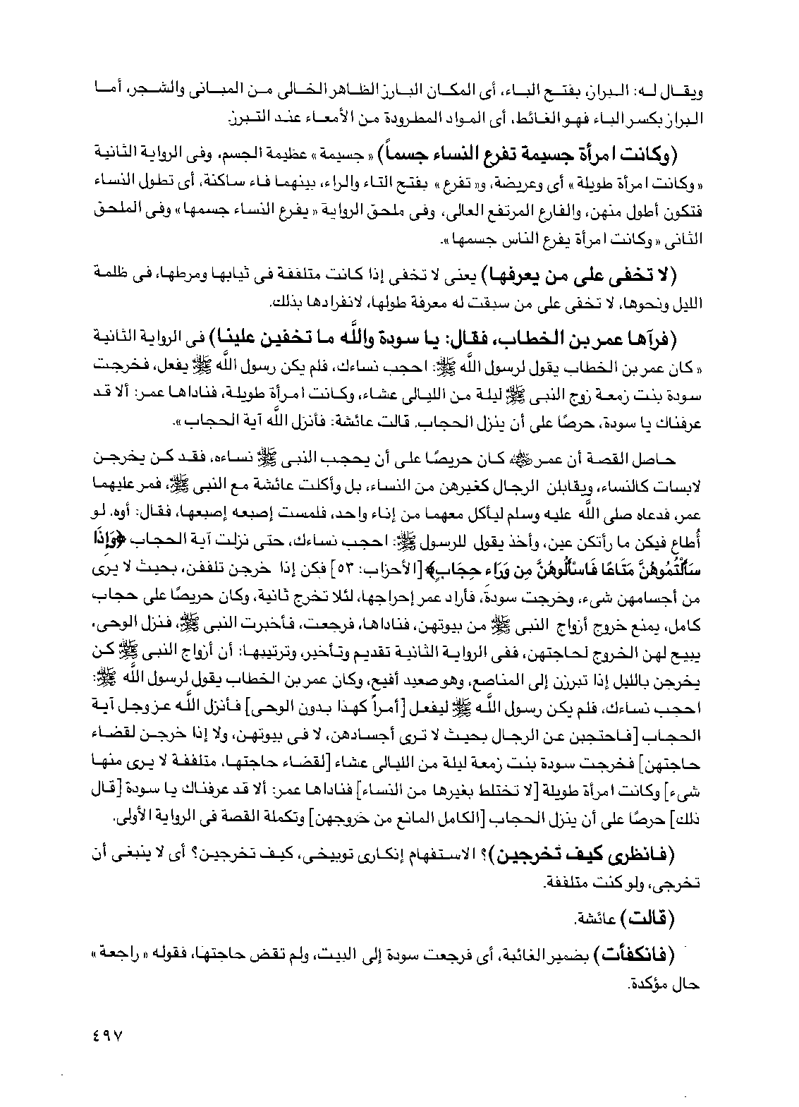 (فرآها عمر بن الخطاب، فقال: يا سودة والله ما تخفين علينا) في الرواية الثانية "كان عمر بن الخطاب يقول لرسول الله صلى الله عليه وسلم: احجب نساءك، فلم يكن رسول الله صلى الله عليه وسلم يفعل، فخرجت سودة بنت زمعة زوج النبي صلى الله عليه وسلم ليلة من الليالي عشاء، وكانت امرأة طويلة، فناداها عمر: ألا قد عرفناك يا سودة، حرصاً على أن ينزل الحجاب. قالت عائشة: فأنزل الله آية الحجاب".