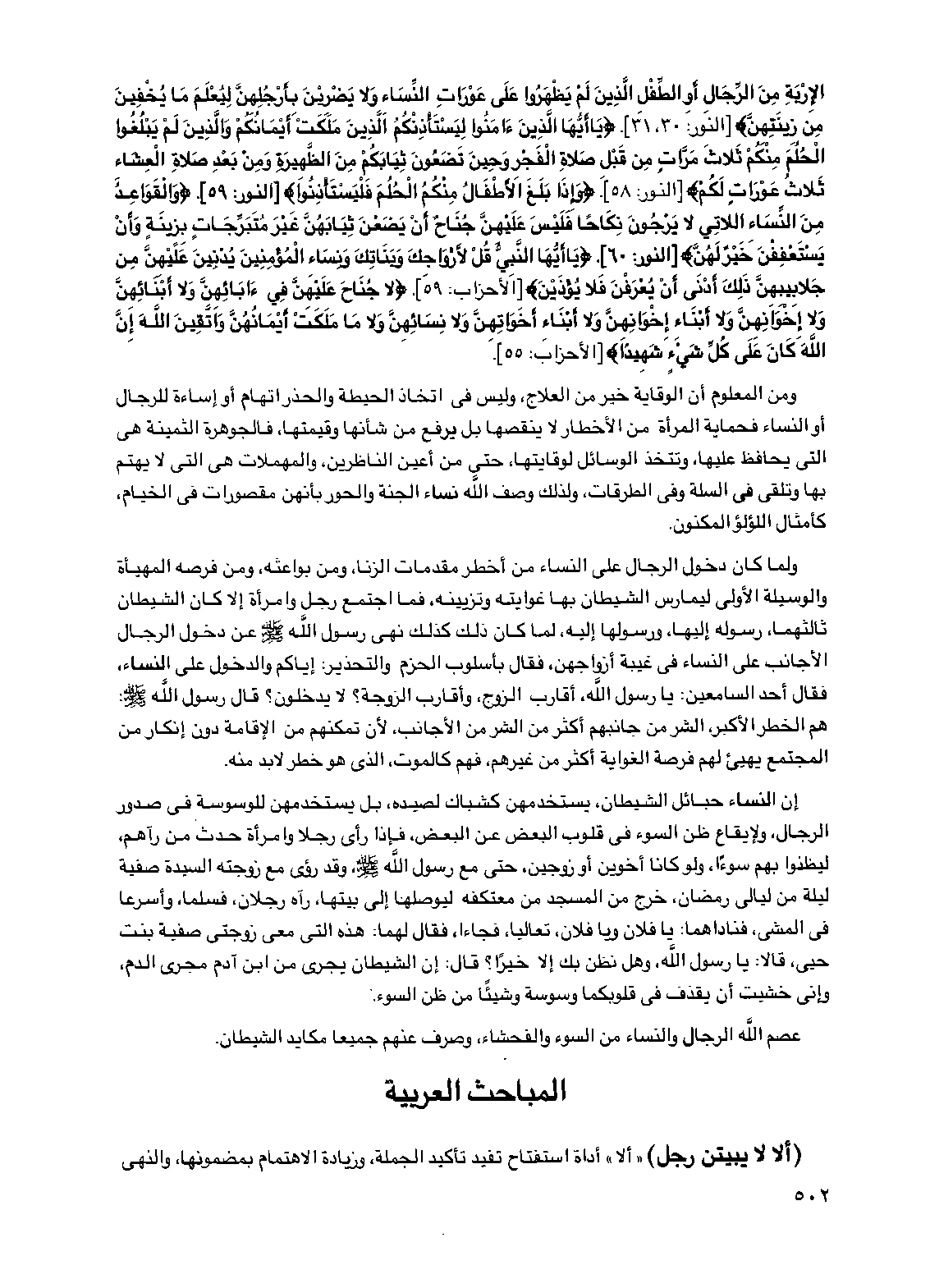 الإربة من الرجال أو الطفل الذين لم يظهروا على عورات النساء ولا يضربن بأرجلهن ليعلم ما يخفين من زينتهن} [النور: 30، 31]. {يا أيها الذين ءامنوا ليستأذنكم الذين ملكت أيمانكم والذين لم يبلغوا الحلم منكم ثلاث مرات من قبل صلاة الفجر وحين تضعون ثيابكم من الظهيرة ومن بعد صلاة العشاء ثلاث عورات لكم} [النور: 58]. {وإذا بلغ الأطفال منكم الحلم فليستأذنوا} [النور: 59]. {والقواعد من النساء اللاتي لا يرجون نكاحاً فليس عليهن جناح أن يضعن ثيابهن غير متبرجات بزينة وأن يستعففن خير لهن} [النور: 60]. {يا أيها النبي قل لأزواجك وبناتك ونساء المؤمنين يدنين عليهن من جلابيبهن ذلك أدنى أن يعرفن فلا يؤذين} [الأحزاب: 59]. {لا جناح عليهن في ءابائهن ولا أبنائهن ولا إخوانهن ولا أبناء إخوانهن ولا أبناء أخواتهن ولا نسائهن ولا ما ملكت أيمانهن واتقين الله إن الله كان على كل شيء شهيدا} [الأحزاب: 55].