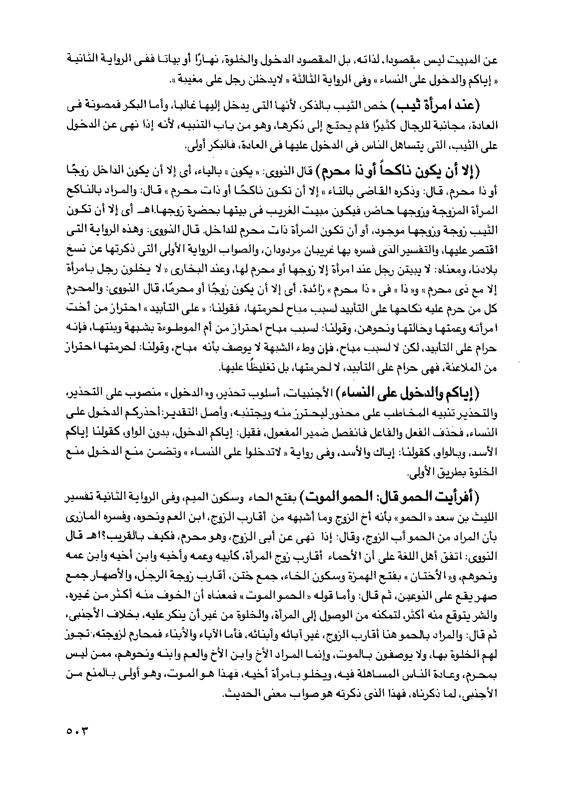 (إلا أن يكون ناكحاً أو ذا محرم) قال النووي: "يكون" بالياء، أي إلا أن يكون الداخل زوجاً أو ذا محرم، قال: وذكره القاضي بالتاء "إلا أن تكون ناكحاً أو ذات محرم" قال: والمراد بالناكح المرأة المزوجة وزوجها حاضر، فيكون مبيت الغريب في بيتها بحضرة زوجها. اهـ أي إلا أن تكون الثيب زوجة وزوجها موجود، أو أن تكون المرأة ذات محرم للداخل. قال النووي: وهذه الرواية التي اقتصر عليها، والتفسير الذي فسره بها غريبان مردودان، والصواب الرواية الأولى التي ذكرتها عن نسخ بلادنا، ومعناه: لا يبيتن رجل عند امرأة إلا زوجها أو محرم لها، وعند البخاري "لا يخلون رجل بامرأة إلا مع ذي محرم" و"ذا" في "ذا محرم" زائدة، أي إلا أن يكون زوجاً أو محرماً، قال النووي: والمحرم كل من حرم عليه نكاحها على التأبيد لسبب مباح لحرمتها، فقولنا: "على التأبيد" احتراز من أخت امرأته وعمتها وخالتها ونحوهن، وقولنا: لسبب مباح احتراز من أم الموطوءة بشبهة وبنتها، فإنه حرام على التأبيد، لكن لا لسبب مباح، فإن وطء الشبهة لا يوصف بأنه مباح، وقولنا: لحرمتها احتراز من الملاعنة، فهي حرام على التأبيد، لا لحرمتها، بل تغليظاً عليها.
