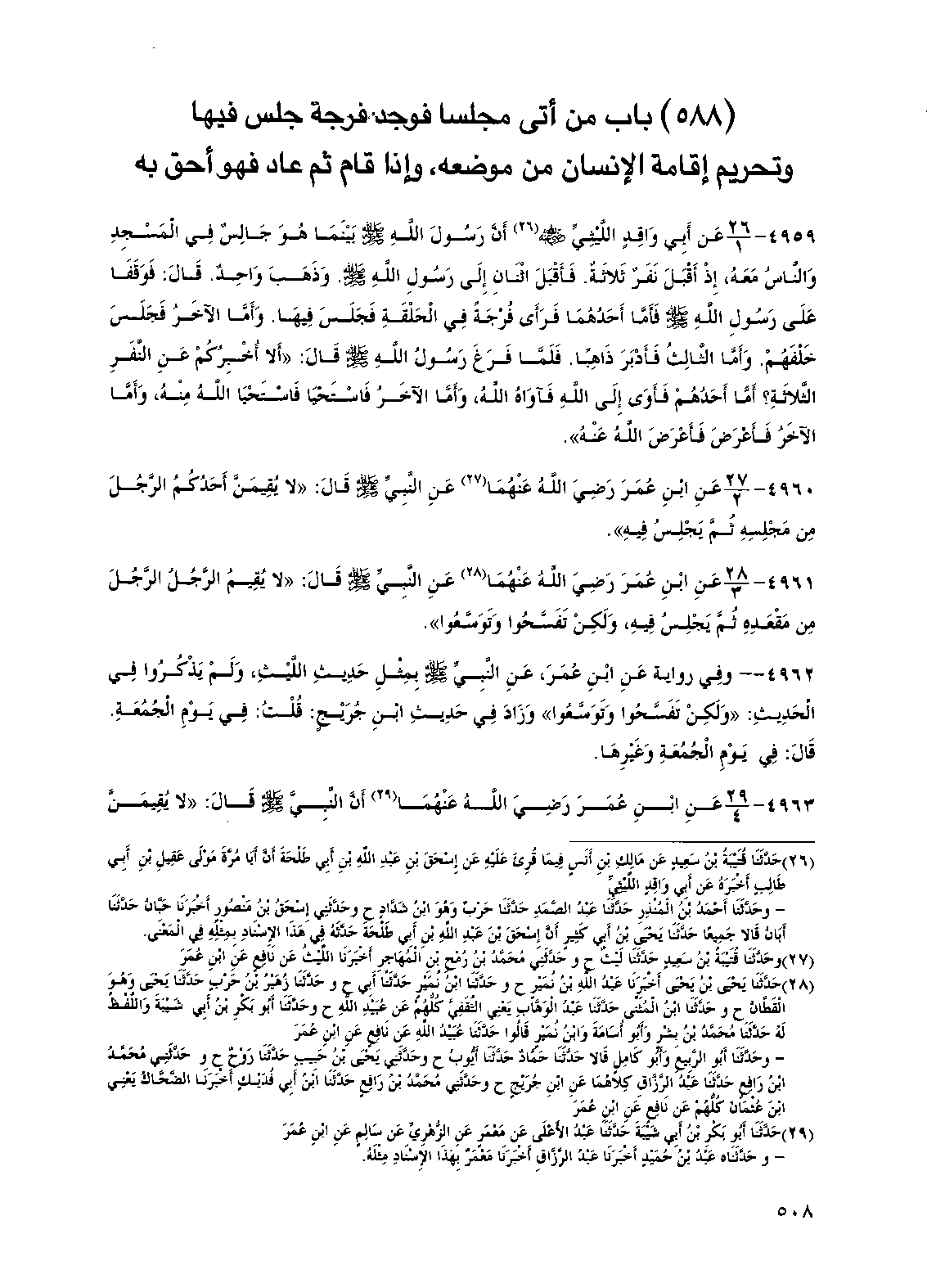 (588) باب من أتى مجلساً فوجد فرجة جلس فيها وتحريم إقامة الإنسان من موضعه، وإذا قام ثم عاد فهو أحق به