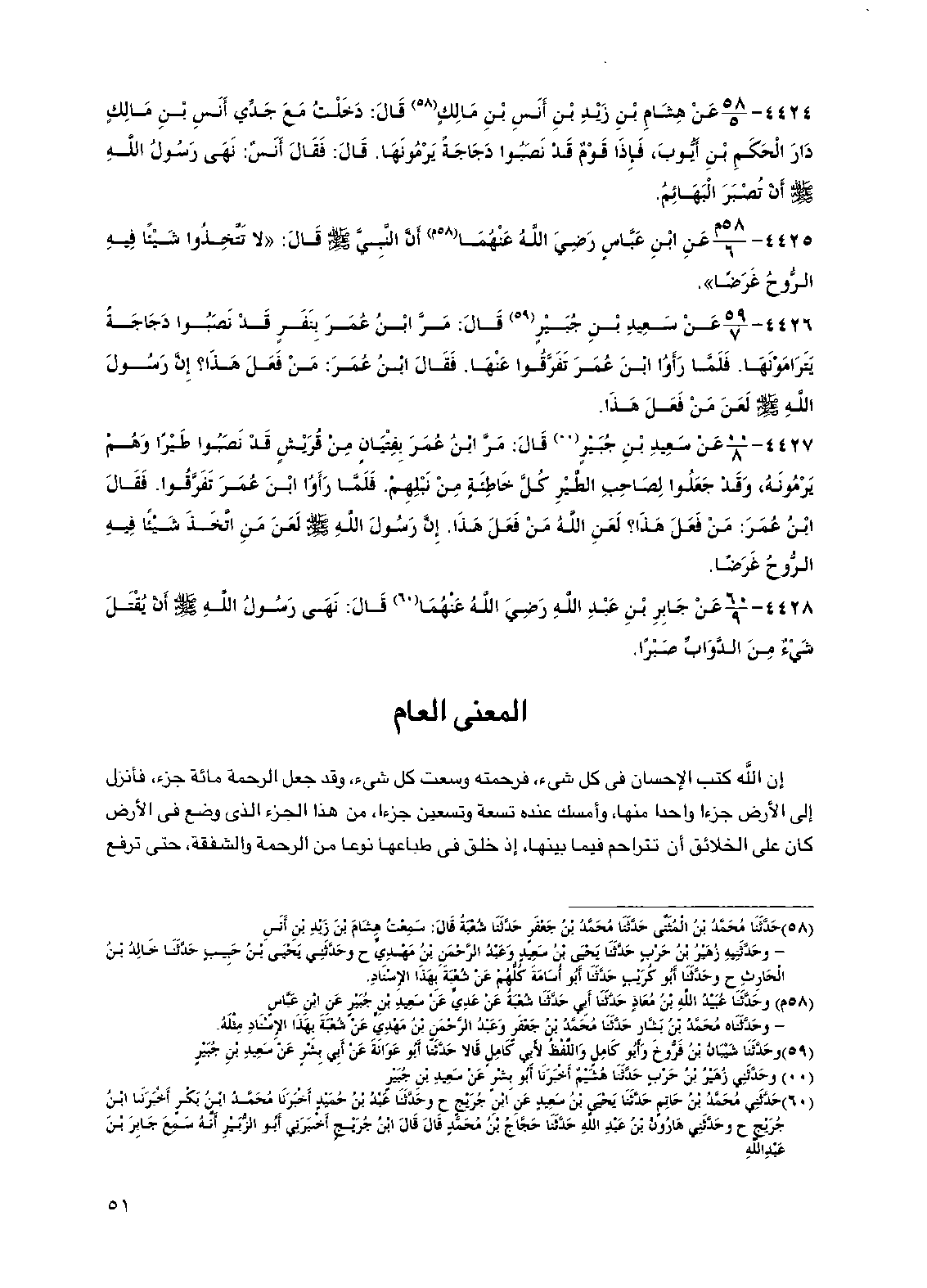 4425 - 58 م عن ابن عباس رضي الله عنهما أن النبي صلى الله عليه وسلم قال: "لا تتخذوا شيئاً فيه الروح غرضاً".