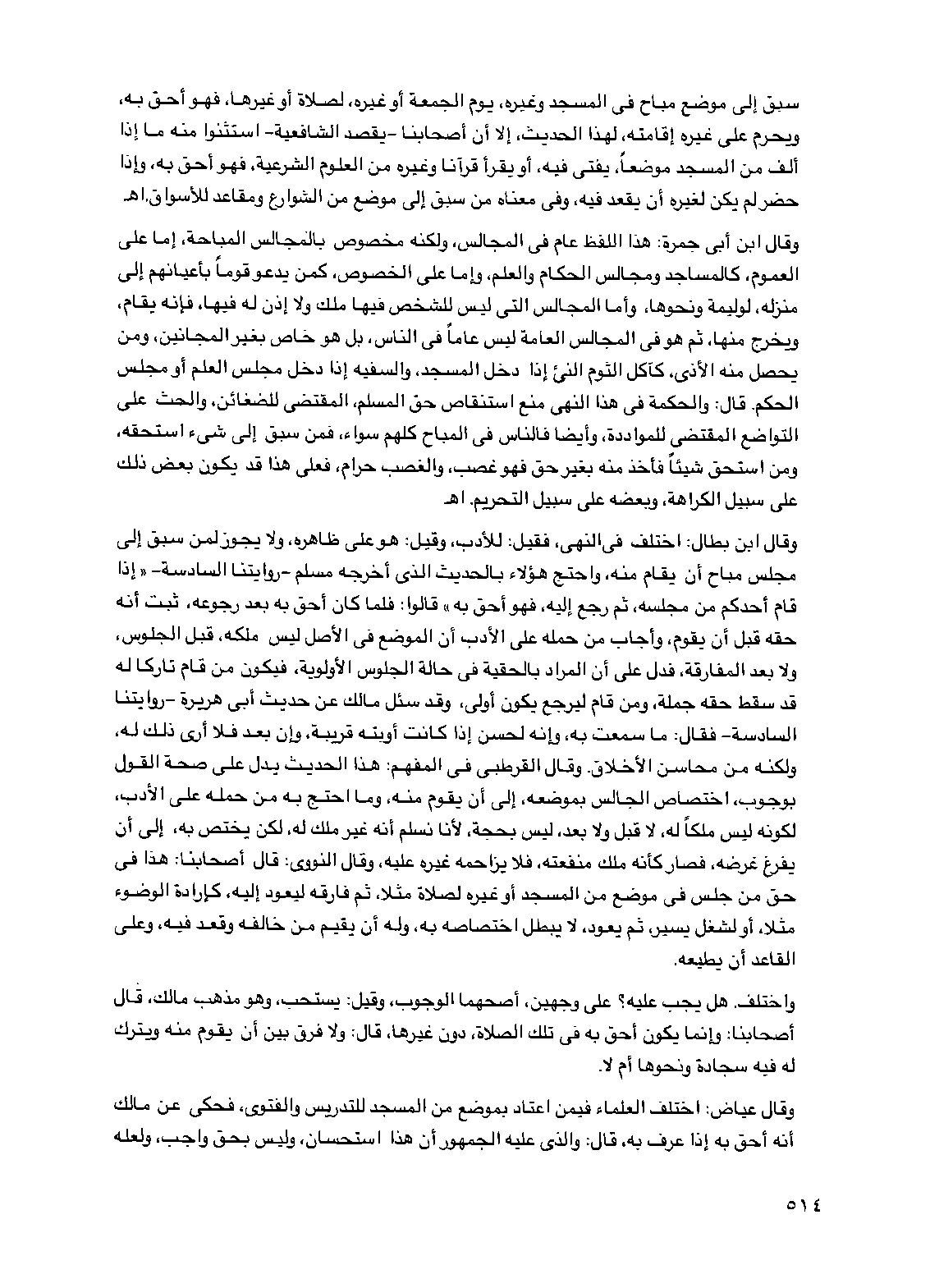 وقال عياض: اختلف العلماء فيمن اعتاد بموضع من المسجد للتدريس والفتوى، فحكي عن مالك أنه أحق به إذا عرف به، قال: والذي عليه الجمهور أن هذا استحسان، وليس بحق واجب، ولعله