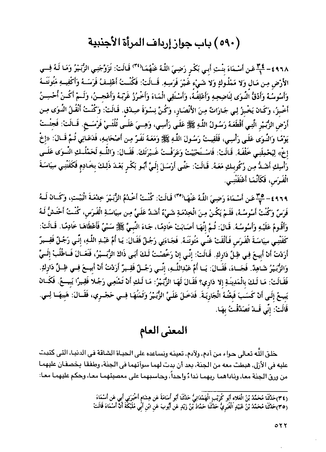 4969 - عن أسماء رضي الله عنها قالت: كنت أخدم الزبير خدمة البيت، وكان له فرس وكنت أسوسه، فلم يكن من الخدمة شيء أشد علي من سياسة الفرس، كنت أحتش له وأقوم عليه وأسوسه. قال: ثم إنها أصابت خادماً، جاء النبي صلى الله عليه وسلم سبي فأعطاها خادماً. قالت: كفتني سياسة الفرس فألقت عني مئونته. فجاءني رجل فقال: يا أم عبد الله، إني رجل فقير أردت أن أبيع في ظل دارك. قالت: إني إن رخصت لك أبي ذاك الزبير، فتعال فاطلب إلي والزبير شاهد. فجاء، فقال: يا أم عبد الله، إني رجل فقير أردت أن أبيع في ظل دارك. فقالت: ما لك بالمدينة إلا داري؟ فقال لها الزبير: ما لك أن تمنعي رجلاً فقيراً يبيع. فكان يبيع إلى أن كسب فبعته الجارية. فدخل علي الزبير وثمنها في حجري، فقال: هبيها لي. قالت: إني قد تصدقت بها.