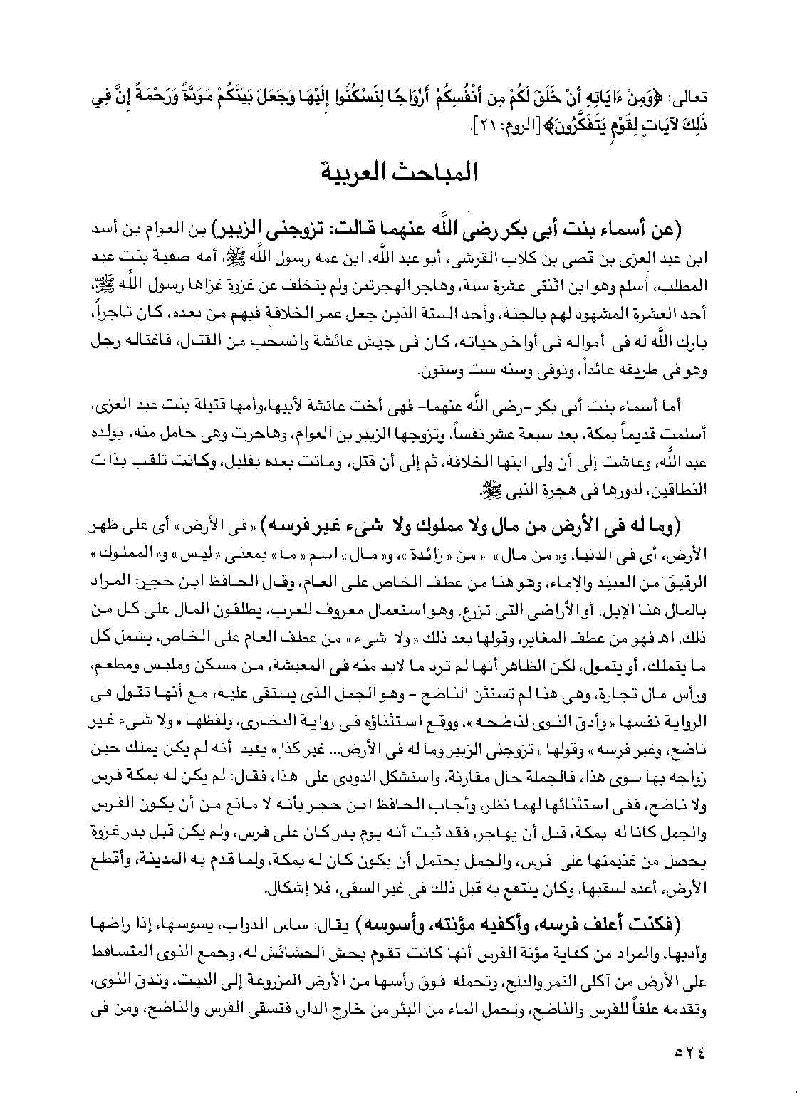 (عن أسماء بنت أبي بكر رضي الله عنهما قالت: تزوجني الزبير) بن العوام بن أسد بن عبد العزى بن قصي بن كلاب القرشي، أبو عبد الله، ابن عمه رسول الله صلى الله عليه وسلم، أمه صفية بنت عبد المطلب، أسلم وهو ابن اثنتي عشرة سنة، وهاجر الهجرتين ولم يتخلف عن غزوة غزاها رسول الله صلى الله عليه وسلم، أحد العشرة المشهود لهم بالجنة، وأحد الستة الذين جعل عمر الخلافة فيهم من بعده، كان تاجراً، بارك الله له في أمواله في أواخر حياته، كان في جيش عائشة وانسحب من القتال، فاغتاله رجل وهو في طريقه عائداً، وتوفي وسنه ست وستون.