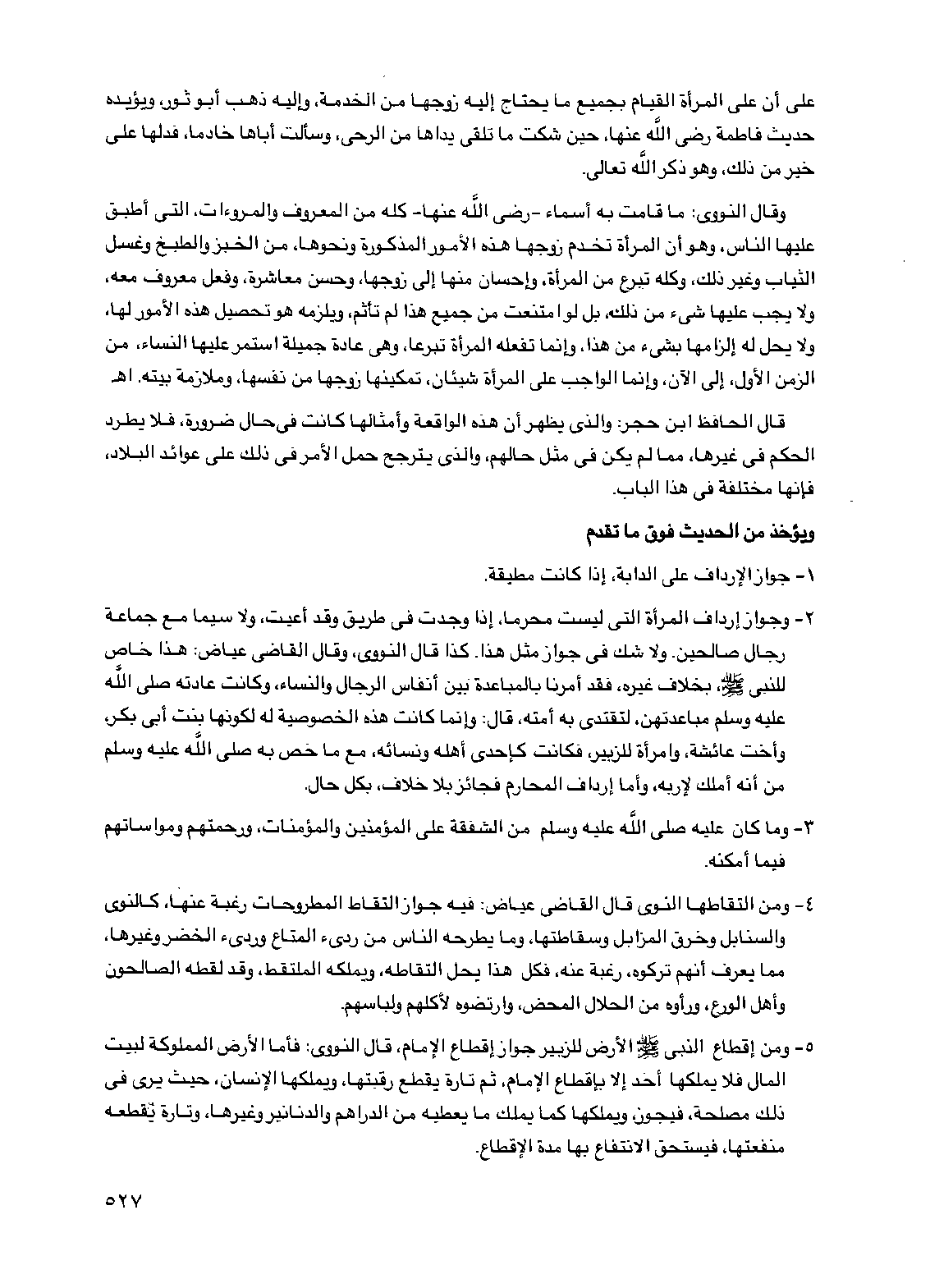 2 - وجواز إرداف المرأة التي ليست محرماً، إذا وجدت في طريق وقد أعيت، ولا سيما مع جماعة رجال صالحين. ولا شك في جواز مثل هذا. كذا قال النووي، وقال القاضي عياض: هذا خاص للنبي صلى الله عليه وسلم، بخلاف غيره، فقد أمرنا بالمباعدة بين أنفاس الرجال والنساء، وكانت عادته صلى الله عليه وسلم مباعدتهن، لتقتدي به أمته، قال: وإنما كانت هذه الخصوصية له لكونها بنت أبي بكر، وأخت عائشة، وامرأة للزبير، فكانت كإحدى أهله ونسائه، مع ما خص به صلى الله عليه وسلم من أنه أملك لإربه، وأما إرداف المحارم فجائز بلا خلاف، بكل حال.