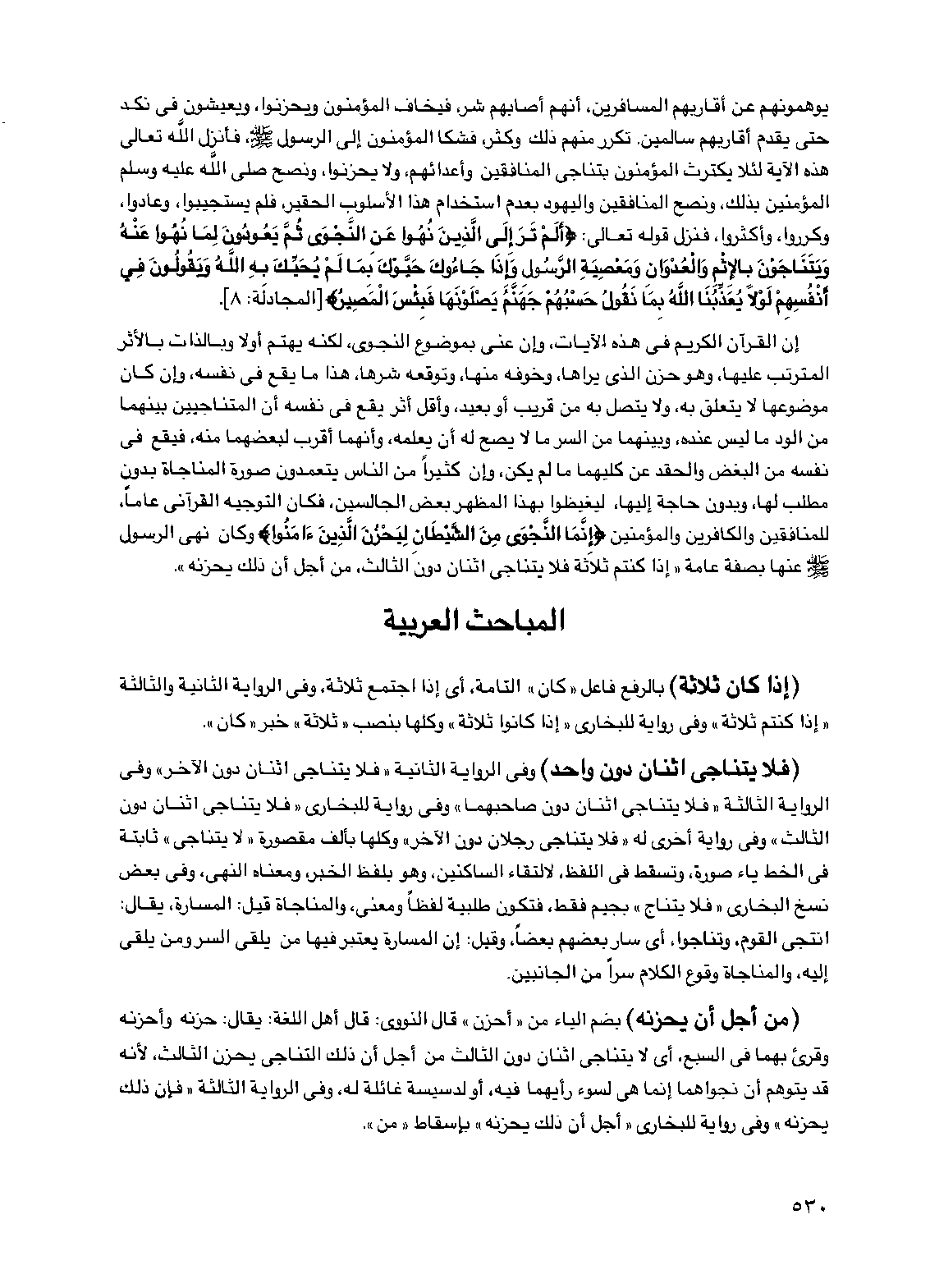 إن القرآن الكريم في هذه الآيات، وإن عني بموضوع النجوى، لكنه يهتم أولاً وبالذات بالأثر المترتب عليها، وهو حزن الذي يراها، وخوفه منها، وتوقعه شرها، هذا ما يقع في نفسه، وإن كان موضوعها لا يتعلق به، ولا يتصل به من قريب أو بعيد، وأقل أثر يقع في نفسه أن المتناجيين بينهما من الود ما ليس عنده، وبينهما من السر ما لا يصح له أن يعلمه، وأنهما أقرب لبعضهما منه، فيقع في نفسه من البغض والحقد عن كليهما ما لم يكن، وإن كثيراً من الناس يتعمدون صورة المناجاة بدون مطلب لها، وبدون حاجة إليها، ليغيظوا بهذا المظهر بعض الجالسين، فكان التوجيه القرآني عاماً، للمنافقين والكافرين والمؤمنين {إنما النجوى من الشيطان ليحزن الذين ءامنوا} وكان نهي الرسول صلى الله عليه وسلم عنها بصفة عامة "إذا كنتم ثلاثة فلا يتناجى اثنان دون الثالث، من أجل أن ذلك يحزنه".
