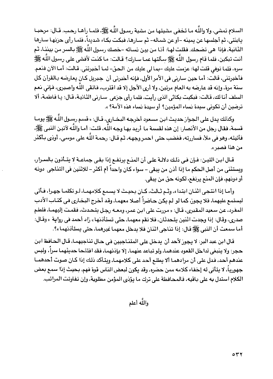 قال ابن عبد البر: لا يجوز لأحد أن يدخل على المتناجيين في حال تناجيهما، قال الحافظ ابن حجر: ولا ينبغي لداخل القعود عندهما، ولو تباعد عنهما، إلا بإذنهما، فقد افتتحا حديثهما سراً، وليس عندهم أحد، فدل على أن مرادهما ألا يطلع أحد على كلامهما، ويتأكد ذلك إذا كان صوت أحدهما جهورياً، لا يتأتى له إخفاء كلامه ممن حضره، وقد يكون لبعض الناس قوة فهم، بحيث إذا سمع بعض الكلام استدل به على باقيه، فالمحافظة على ترك ما يؤذي المؤمن مطلوبة، وإن تفاوتت المراتب.