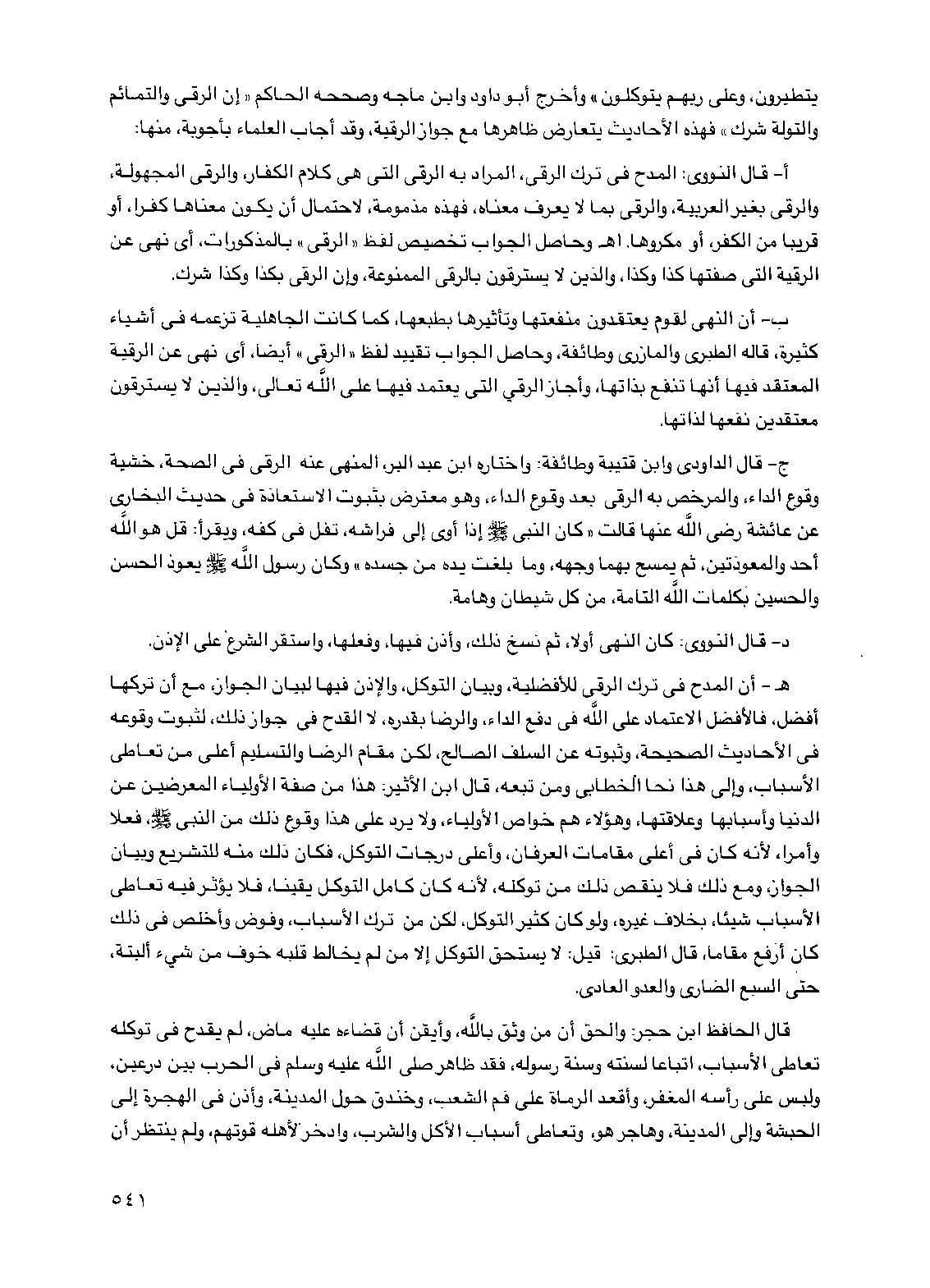 ب- أن النهي لقوم يعتقدون منفعتها وتأثيرها بطبعها، كما كانت الجاهلية تزعمه في أشياء كثيرة، قاله الطبري والمازري وطائفة، وحاصل الجواب تقييد لفظ "الرقى" أيضاً، أي نهي عن الرقية المعتقد فيها أنها تنفع بذاتها، وأجاز الرقى التي يعتمد فيها على الله تعالى، والذين لا يسترقون معتقدين نفعها لذاتها.