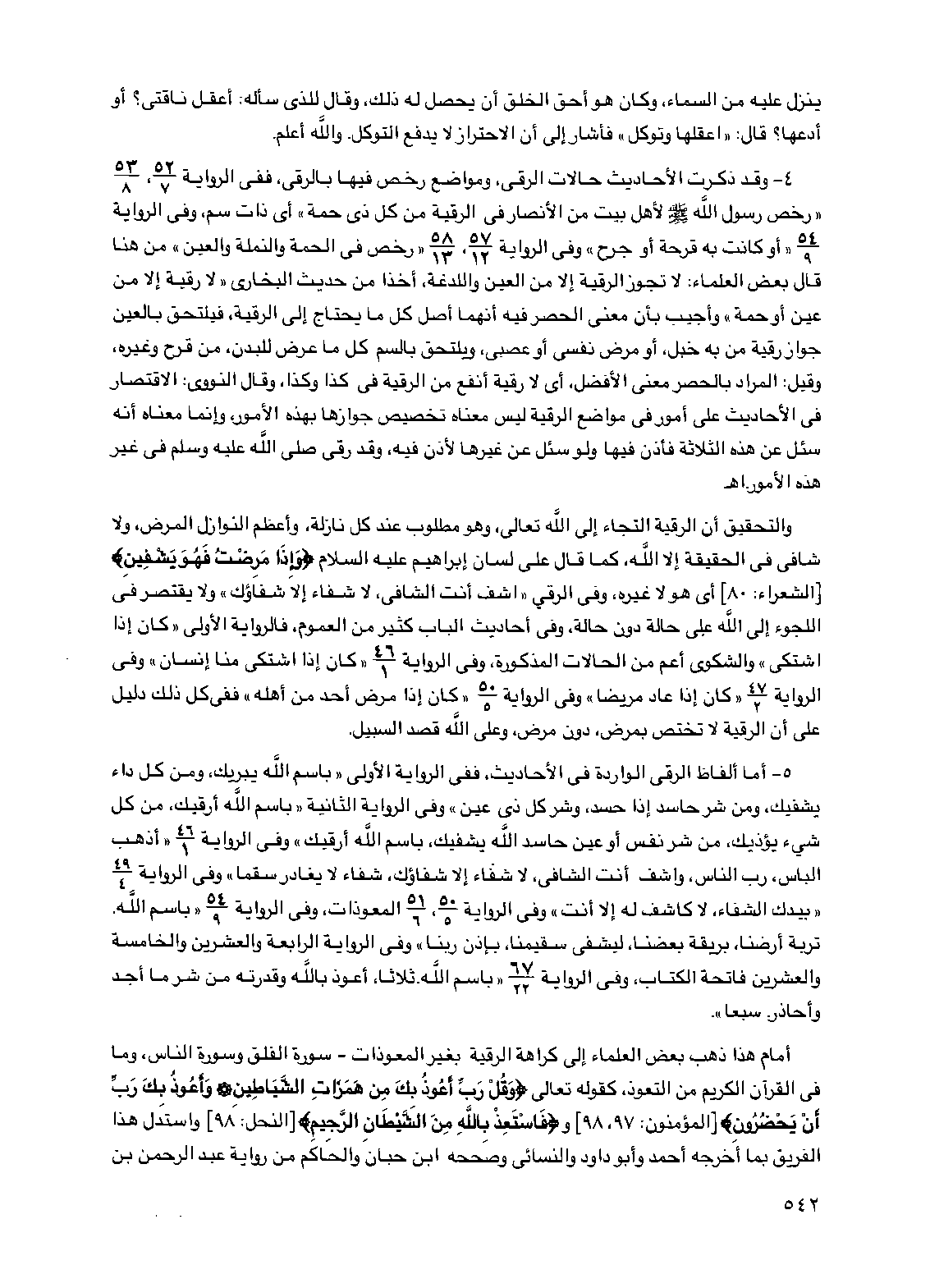 4 - وقد ذكرت الأحاديث حالات الرقى، ومواضع رخص فيها بالرقى، ففي الرواية، "رخص رسول الله صلى الله عليه وسلم لأهل بيت من الأنصار في الرقية من كل ذي حمة" أي ذات سم، وفي الرواية "أو كانت به قرحة أو جرح" وفي الرواية، "رخص في الحمة والنملة والعين" من هنا قال بعض العلماء: لا تجوز الرقية إلا من العين واللدغة، أخذاً من حديث البخاري "لا رقية إلا من عين أو حمة" وأجيب بأن معنى الحصر فيه أنهما أصل كل ما يحتاج إلى الرقية، فيلتحق بالعين جواز رقية من به خبل، أو مرض نفسي أو عصبي، ويلتحق بالسم كل ما عرض للبدن، من قرح وغيره، وقيل: المراد بالحصر معنى الأفضل، أي لا رقية أنفع من الرقية في كذا وكذا، وقال النووي: الاقتصار في الأحاديث على أمور في مواضع الرقية ليس معناه تخصيص جوازها بهذه الأمور، وإنما معناه أنه سئل عن هذه الثلاثة فأذن فيها ولو سئل عن غيرها لأذن فيه، وقد رقى صلى الله عليه وسلم في غير هذه الأمور. اهـ