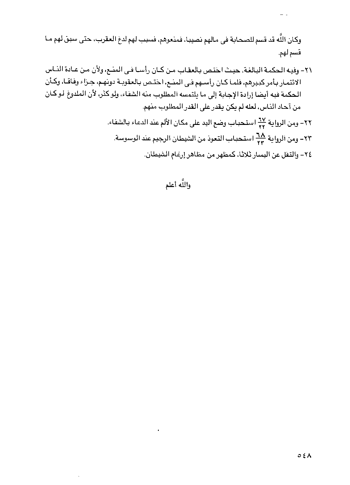 21 - وفيه الحكمة البالغة، حيث اختص بالعقاب من كان رأساً في المنع، ولأن من عادة الناس الائتمار بأمر كبيرهم، فلما كان رأسهم في المنع، اختص بالعقوبة دونهم، جزاء وفاقا، وكأن الحكمة فيه أيضاً إرادة الإجابة إلى ما يلتمسه المطلوب منه الشفاء، ولو كثر، لأن الملدوغ لو كان من آحاد الناس، لعله لم يكن يقدر على القدر المطلوب منهم.