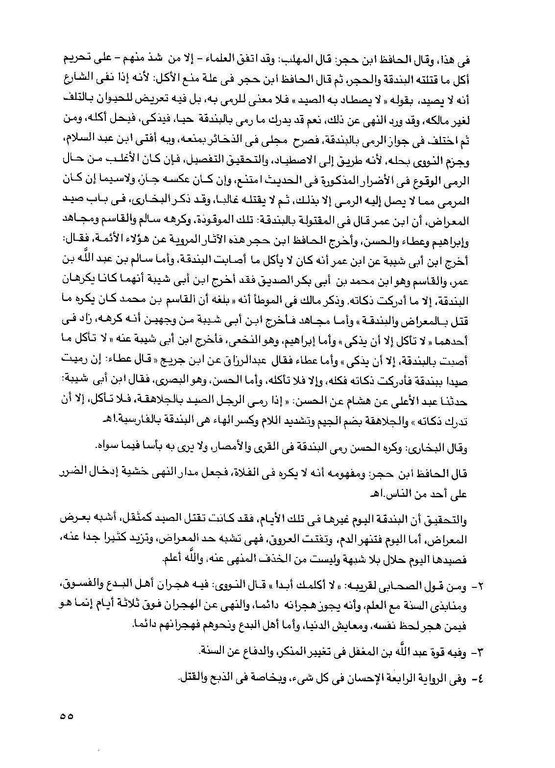 في هذا، وقال الحافظ ابن حجر: قال المهلب: وقد اتفق العلماء -إلا من شذ منهم- على تحريم أكل ما قتلته البندقة والحجر، ثم قال الحافظ ابن حجر في علة منع الأكل: لأنه إذا نفى الشارع أنه لا يصيد، بقوله "لا يصطاد به الصيد" فلا معنى للرمي به، بل فيه تعريض للحيوان بالتلف لغير مالكه، وقد ورد النهي عن ذلك، نعم قد يدرك ما رمى بالبندقة حياً، فيذكى، فيحل أكله، ومن ثم اختلف في جواز الرمي بالبندقة، فصرح مجلي في الذخائر بمنعه، وبه أفتى ابن عبد السلام، وجزم النووي بحله، لأنه طريق إلى الاصطياد، والتحقيق التفصيل، فإن كان الأغلب من حال الرمي الوقوع في الأضرار المذكورة في الحديث امتنع، وإن كان عكسه جاز، ولا سيما إن كان المرمي مما لا يصل إليه الرمي إلا بذلك، ثم لا يقتله غالباً، وقد ذكر البخاري، في باب صيد المعراض، أن ابن عمر قال في المقتولة بالبندقة: تلك الموقوذة، وكرهه سالم والقاسم ومجاهد وإبراهيم وعطاء والحسن، وأخرج الحافظ ابن حجر هذه الآثار المروية عن هؤلاء الأئمة، فقال: أخرج ابن أبي شيبة عن ابن عمر أنه كان لا يأكل ما أصابت البندقة، وأما سالم بن عبد الله بن عمر، والقاسم وهو ابن محمد بن أبي بكر الصديق فقد أخرج ابن أبي شيبة أنهما كانا يكرهان البندقة، إلا ما أدركت ذكاته.