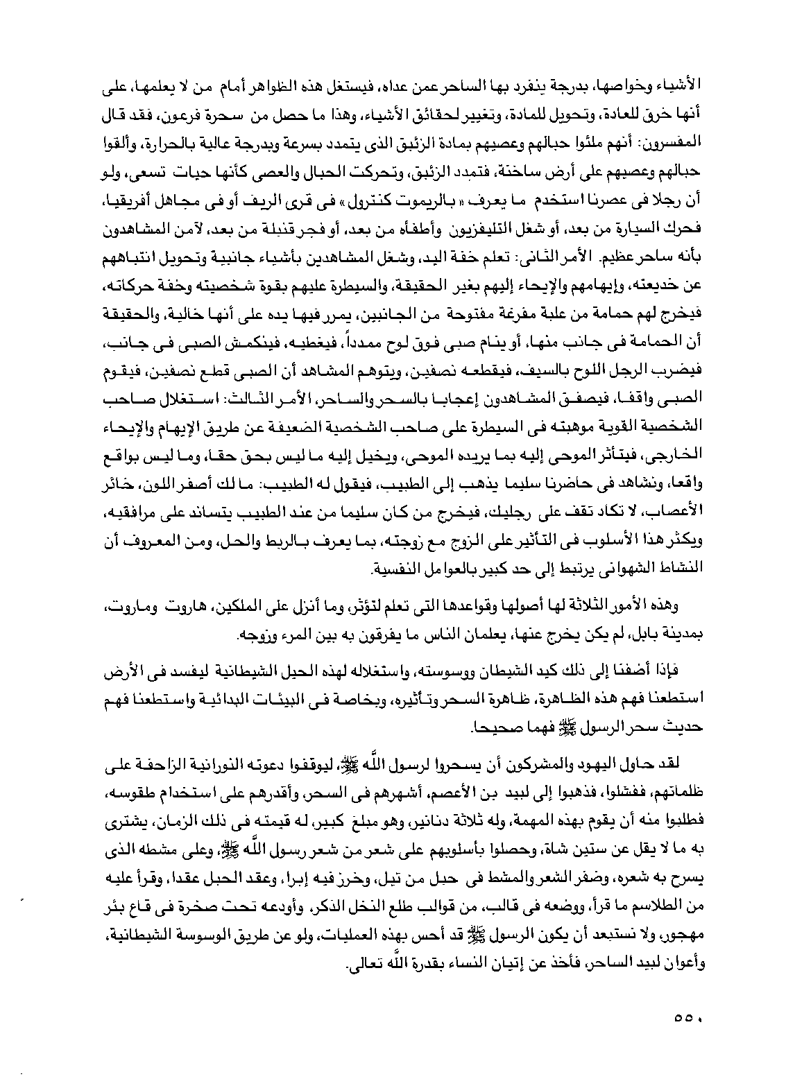 الأشياء وخواصها، بدرجة ينفرد بها الساحر عمن عداه، فيستغل هذه الظواهر أمام من لا يعلمها، على أنها خرق للعادة، وتحويل للمادة، وتغيير لحقائق الأشياء، وهذا ما حصل من سحرة فرعون، فقد قال المفسرون: أنهم ملئوا حبالهم وعصيهم بمادة الزئبق الذي يتمدد بسرعة وبدرجة عالية بالحرارة، وألقوا حبالهم وعصيهم على أرض ساخنة، فتمدد الزئبق، وتحركت الحبال والعصى كأنها حيات تسعى، ولو أن رجلاً في عصرنا استخدم ما يعرف "بالريموت كنترول" في قرى الريف أو في مجاهل أفريقيا، فحرك السيارة من بعد، أو شغل التليفزيون وأطفأه من بعد، أو فجر قنبلة من بعد، لآمن المشاهدون بأنه ساحر عظيم.