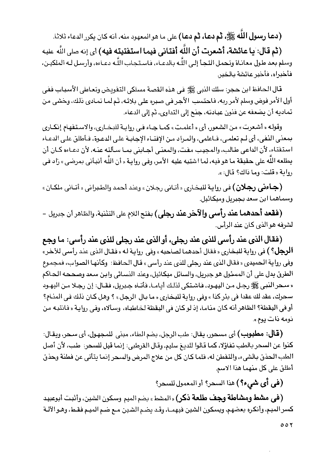 (فقال الذي عند رأسي للذي عند رجلي، أو الذي عند رجلي للذي عند رأسي: ما وجع الرجل؟ ) في رواية للبخاري "فقال أحدهما لصاحبه" وفي رواية له "فقال الذي عند رأسي للآخر" وفي رواية الحميدي "فقال الذي عند رجلي للذي عند رأسي" قال الحافظ: وكأنها الصواب، فمجموع الطرق يدل على أن المسئول هو جبريل، والسائل ميكائيل، وعند النسائي وابن سعد وصححه الحاكم "سحر النبي صلى الله عليه وسلم رجل من اليهود، فاشتكى لذلك أياماً، فأتاه جبريل، فقال: إن رجلاً من اليهود سحرك، عقد لك عقداً في بئر كذا" وفي رواية للبخاري "ما بال الرجل"؟ وهل كان ذلك في المنام؟ أو في اليقظة؟ الظاهر أنه كان مناماً، إذ لو كان في اليقظة لخاطباه، وسألاه، وفي رواية "فانتبه من نومه ذات يوم".