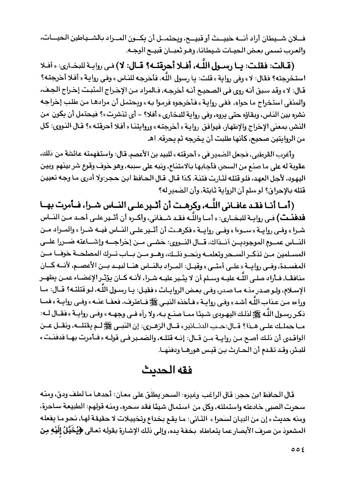 وأغرب القرطبي، فجعل الضمير في "أحرقته" للبيد بن الأعصم، قال: واستفهمته عائشة من ذلك، عقوبة له على ما صنع من السحر، فأجابها بالامتناع، ونبه على سببه، وهو خوف وقوع شر بينهم وبين اليهود، لأجل العهد، فلو قتله لثارت فتنة. كذا قال. قال الحافظ ابن حجر: ولا أدري ما وجه تعيين قتله بالإحراق؟ لو سلم أن الرواية ثابتة، وأن الضمير له؟ .