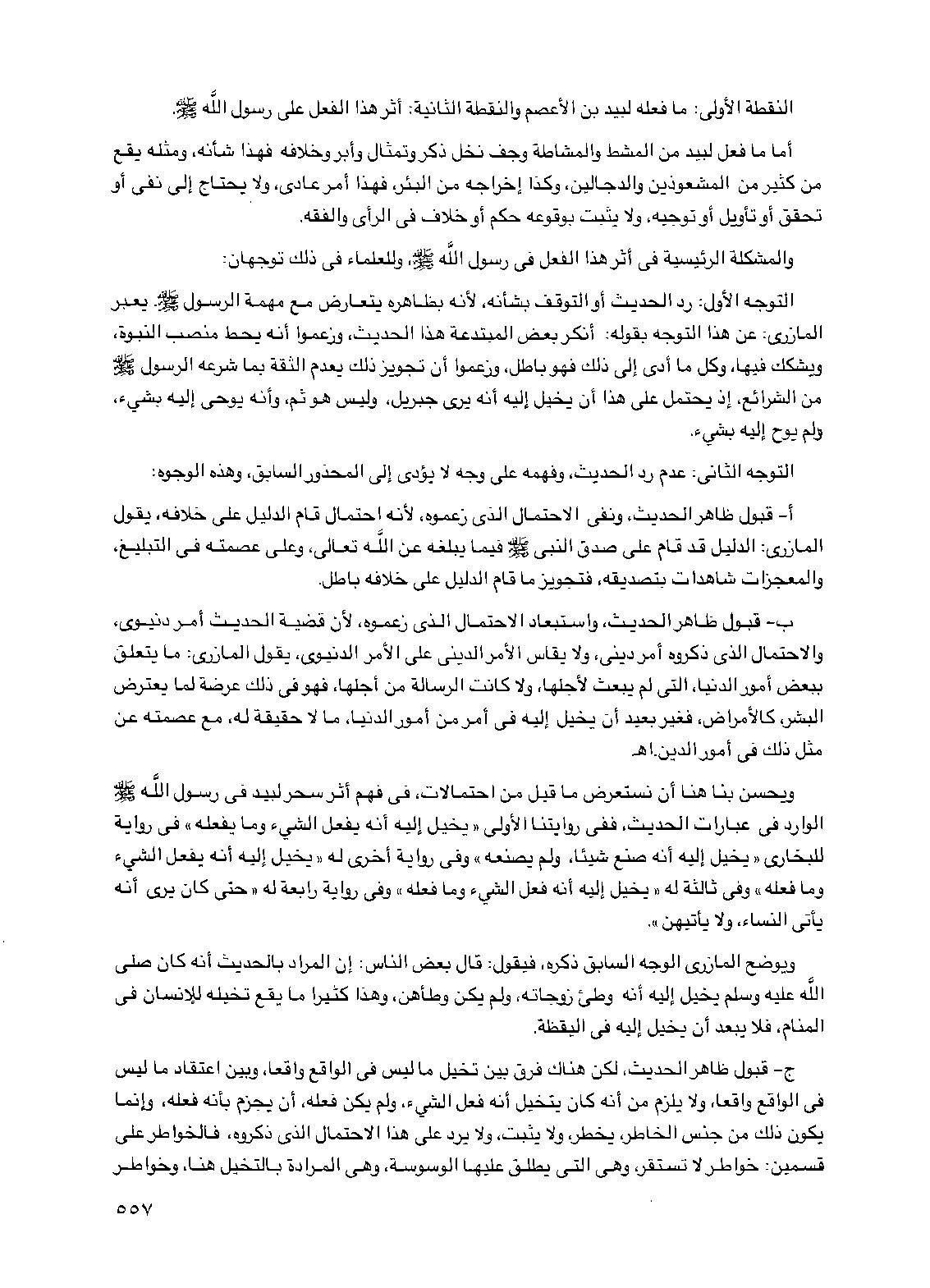ب- قبول ظاهر الحديث، واستبعاد الاحتمال الذي زعموه، لأن قضية الحديث أمر دنيوي، والاحتمال الذي ذكروه أمر ديني، ولا يقاس الأمر الديني على الأمر الدنيوي، يقول المازري: ما يتعلق ببعض أمور الدنيا، التي لم يبعث لأجلها، ولا كانت الرسالة من أجلها، فهو في ذلك عرضة لما يعترض البشر، كالأمراض، فغير بعيد أن يخيل إليه في أمر من أمور الدنيا، ما لا حقيقة له، مع عصمته عن مثل ذلك في أمور الدين. اهـ