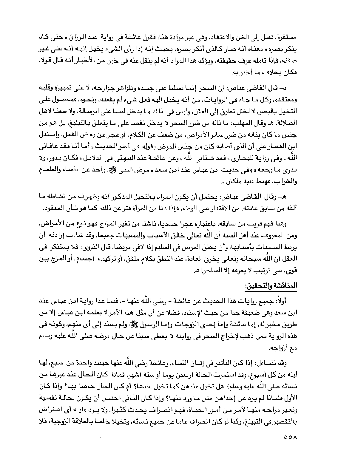 د- قال القاضي عياض: إن السحر إنما تسلط على جسده وظواهر جوارحه، لا على تمييزه وقلبه ومعتقده، وكل ما جاء في الروايات، من أنه يخيل إليه فعل شيء لم يفعله، ونحوه، فمحمول على التخيل بالبصر، لا لخلل تطرق إلى العقل، وليس في ذلك ما يدخل لبساً على الرسالة، ولا طعناً لأهل الضلالة. اهـ وقال المهلب: ما ناله من ضرر السحر لا يدخل نقصاً على ما يتعلق بالتبليغ، بل هو من جنس ما كان يناله من ضرر سائر الأمراض، من ضعف عن الكلام، أو عجز عن بعض الفعل، واستدل ابن القصار على أن الذي أصابه كان من جنس المرض بقوله في آخر الحديث "أما أنا فقد عافاني الله" وفي رواية للبخاري "فقد شفاني الله" وعن عائشة عند البيهقي في الدلائل "فكان يدور، ولا يدري ما وجعه" وفي حديث ابن عباس عند ابن سعد "مرض النبي صلى الله عليه وسلم، وأخذ عن النساء والطعام والشراب، فهبط عليه ملكان".