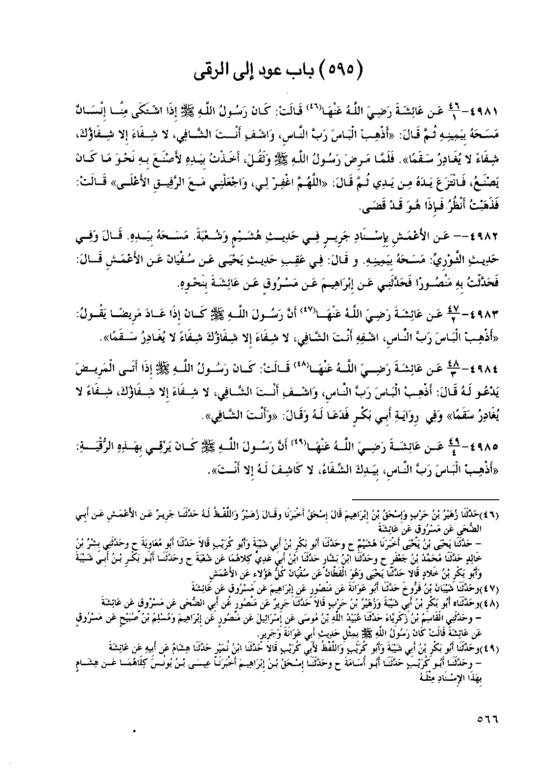 4985 - عن عائشة رضي الله عنها أن رسول الله صلى الله عليه وسلم كان يرقي بهذه الرقية: "أذهب الباس رب الناس، بيدك الشفاء، لا كاشف له إلا أنت".