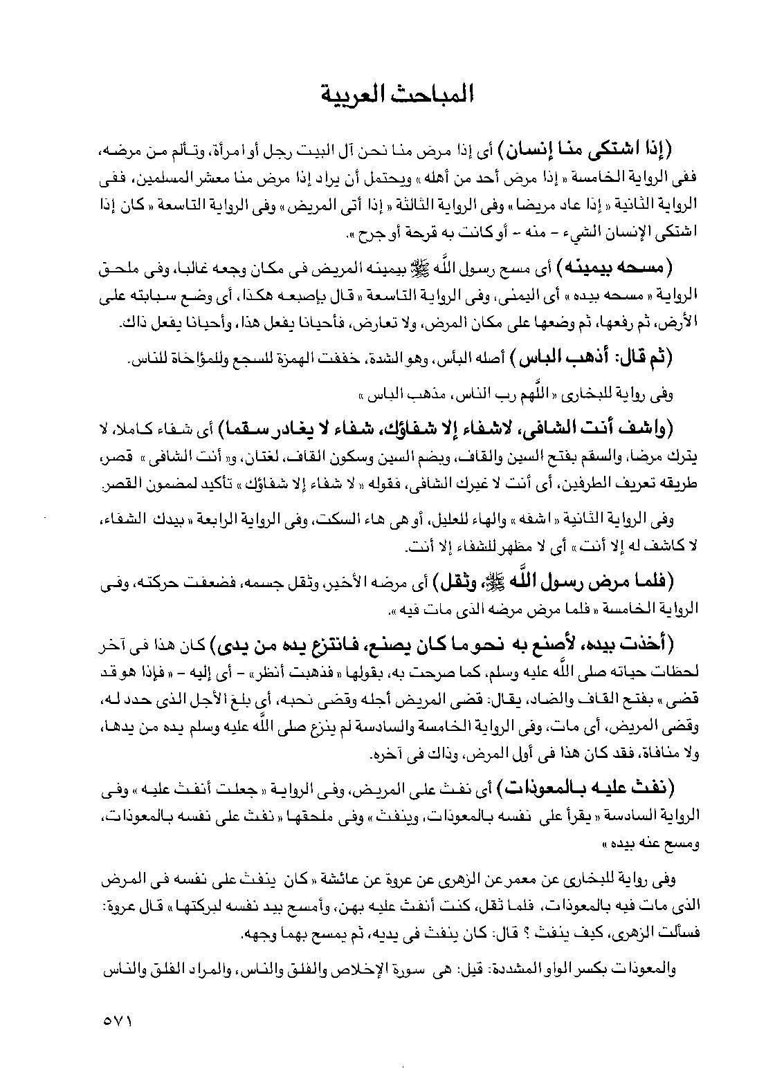 وفي رواية للبخاري عن معمر عن الزهري عن عروة عن عائشة "كان ينفث على نفسه في المرض الذي مات فيه بالمعوذات، فلما ثقل، كنت أنفث عليه بهن، وأمسح بيد نفسه لبركتها" قال عروة: فسألت الزهري، كيف ينفث؟ قال: كان ينفث في يديه، ثم يمسح بهما وجهه.