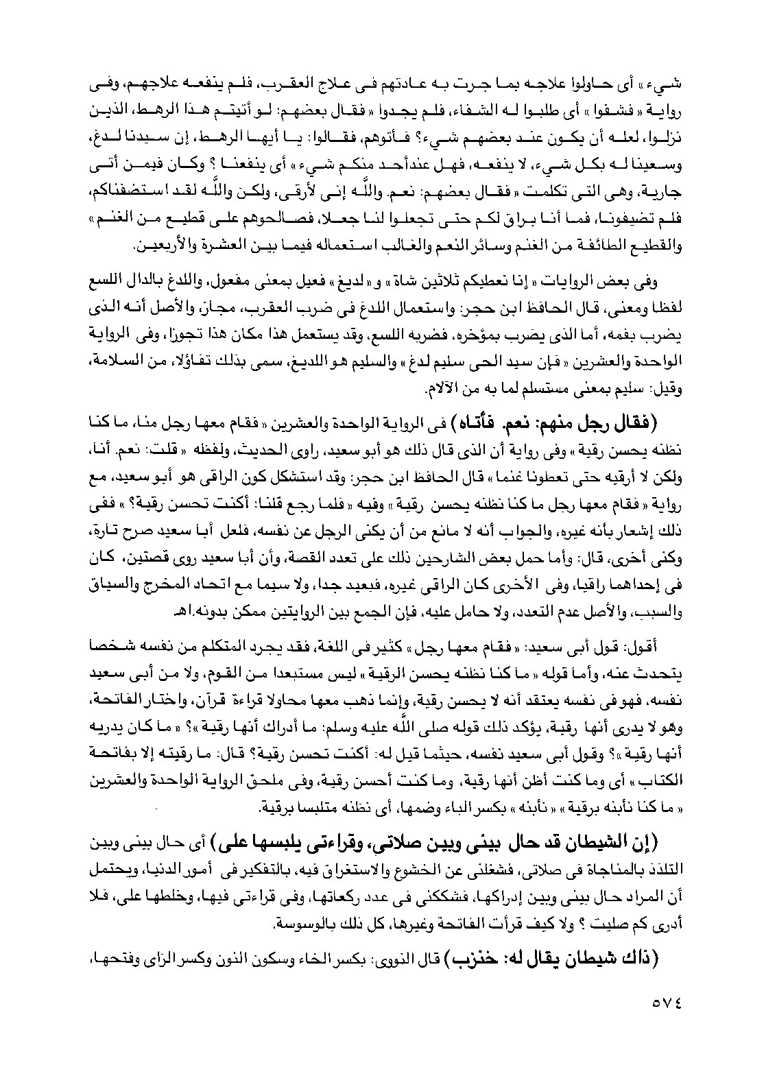أقول: قول أبي سعيد: "فقام معها رجل" كثير في اللغة، فقد يجرد المتكلم من نفسه شخصاً يتحدث عنه، وأما قوله "ما كنا نظنه يحسن الرقية" ليس مستبعداً من القوم، ولا من أبي سعيد نفسه، فهو في نفسه يعتقد أنه لا يحسن رقية، وإنما ذهب معها محاولاً قراءة قرآن، واختار الفاتحة، وهو لا يدري أنها رقية، يؤكد ذلك قوله صلى الله عليه وسلم: ما أدراك أنها رقية"؟ "ما كان يدريه أنها رقية"؟ وقول أبي سعيد نفسه، حيثما قيل له: أكنت تحسن رقية؟ قال: ما رقيته إلا بفاتحة الكتاب" أي وما كنت أظن أنها رقية، وما كنت أحسن رقية، وفي ملحق الرواية الواحدة والعشرين "ما كنا نأبنه برقية" "نأبنه" بكسر الباء وضمها، أي نظنه متلبساً برقية.