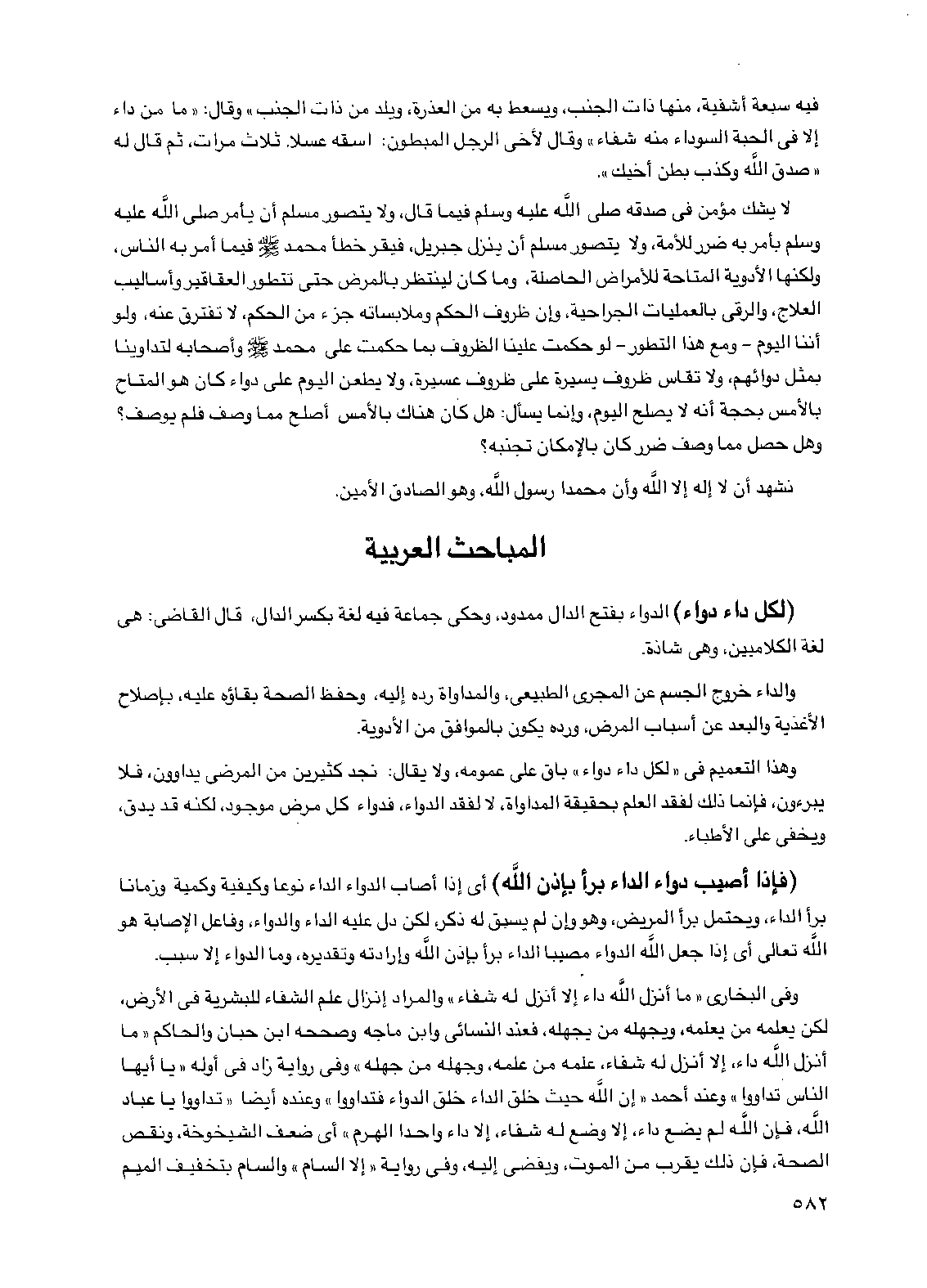فيه سبعة أشفية، منها ذات الجنب، ويسعط به من العذرة، ويلد من ذات الجنب" وقال: "ما من داء إلا في الحبة السوداء منه شفاء" وقال لأخي الرجل المبطون: اسقه عسلاً، ثلاث مرات، ثم قال له "صدق الله وكذب بطن أخيك".