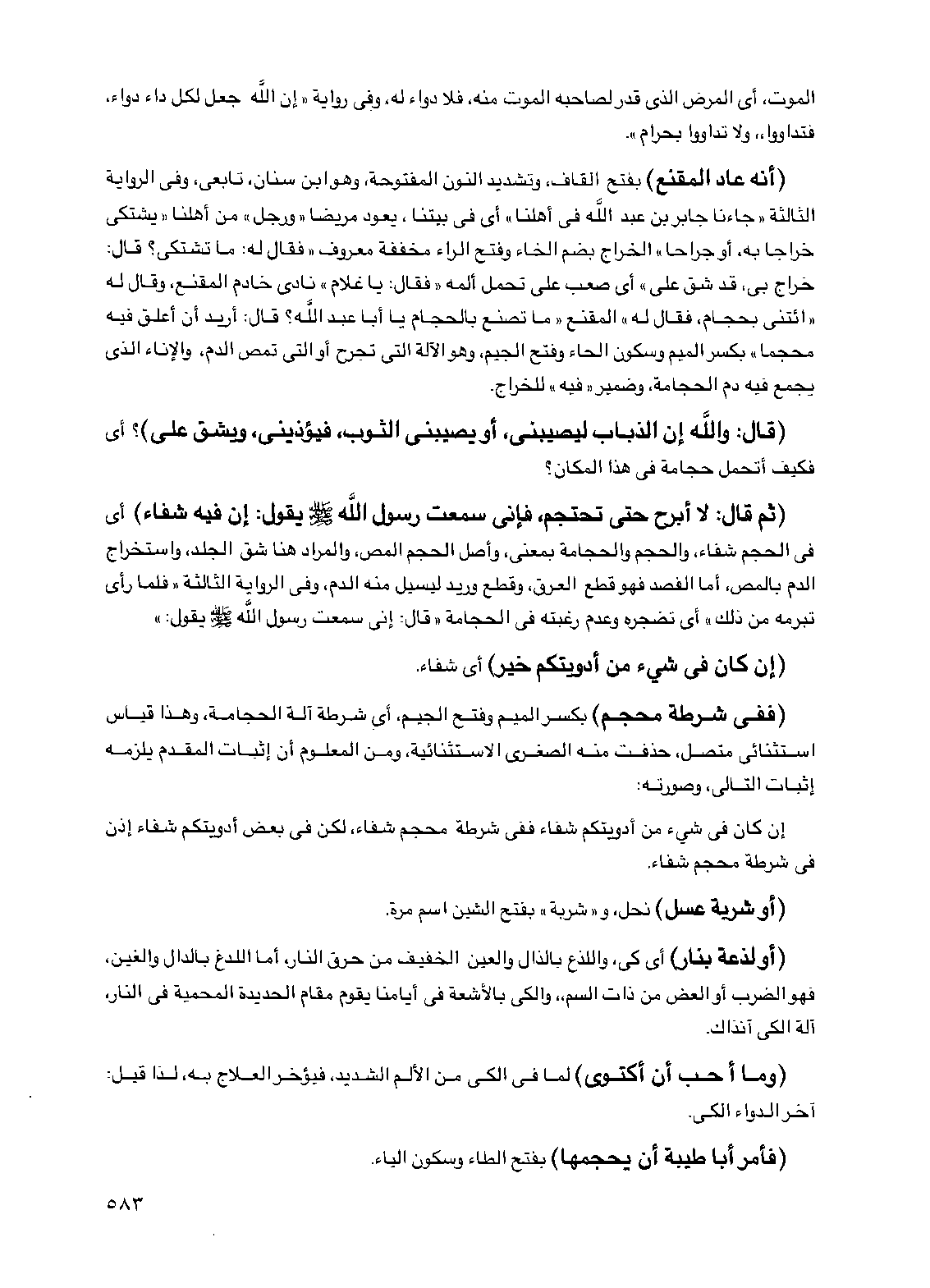(أنه عاد المقنع) بفتح القاف، وتشديد النون المفتوحة، وهو ابن سنان، تابعي، وفي الرواية الثالثة "جاءنا جابر بن عبد الله في أهلنا" أي في بيتنا، يعود مريضاً "ورجل" من أهلنا "يشتكي خراجاً به، أو جراحاً" الخراج بضم الخاء وفتح الراء مخففة معروف "فقال له: ما تشتكي؟ قال: خراج بي، قد شق علي" أي صعب على تحمل ألمه "فقال: يا غلام" نادى خادم المقنع، وقال له "ائتني بحجام، فقال له" المقنع "ما تصنع بالحجام يا أبا عبد الله؟ قال: أريد أن أعلق فيه محجماً" بكسر الميم وسكون الحاء وفتح الجيم، وهو الآلة التي تجرح أو التي تمص الدم، والإناء الذي يجمع فيه دم الحجامة، وضمير "فيه" للخراج.
