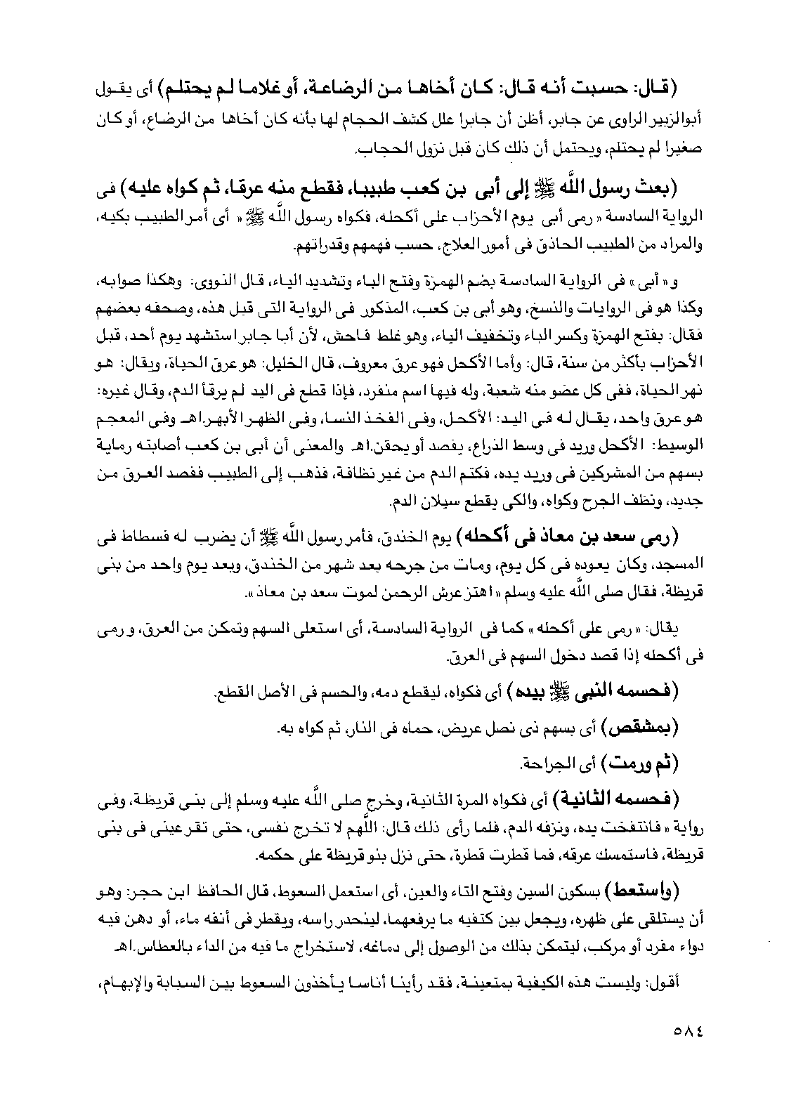 و"أبي" في الرواية السادسة بضم الهمزة وفتح الباء وتشديد الياء، قال النووي: وهكذا صوابه، وكذا هو في الروايات والنسخ، وهو أبي بن كعب، المذكور في الرواية التي قبل هذه، وصحفه بعضهم فقال: بفتح الهمزة وكسر الباء وتخفيف الياء، وهو غلط فاحش، لأن أبا جابر استشهد يوم أحد، قبل الأحزاب بأكثر من سنة، قال: وأما الأكحل فهو عرق معروف، قال الخليل: هو عرق الحياة، ويقال: هو نهر الحياة، ففي كل عضو منه شعبة، وله فيها اسم منفرد، فإذا قطع في اليد لم يرقأ الدم، وقال غيره: هو عرق واحد، يقال له في اليد: الأكحل، وفي الفخذ النسا، وفي الظهر الأبهر. اهـ وفي المعجم الوسيط: الأكحل وريد في وسط الذراع، يفصد أو يحقن. اهـ والمعنى أن أبي بن كعب أصابته رماية بسهم من المشركين في وريد يده، فكتم الدم من غير نظافة، فذهب إلى الطبيب ففصد العرق من جديد، ونظف الجرح وكواه، والكي يقطع سيلان الدم.